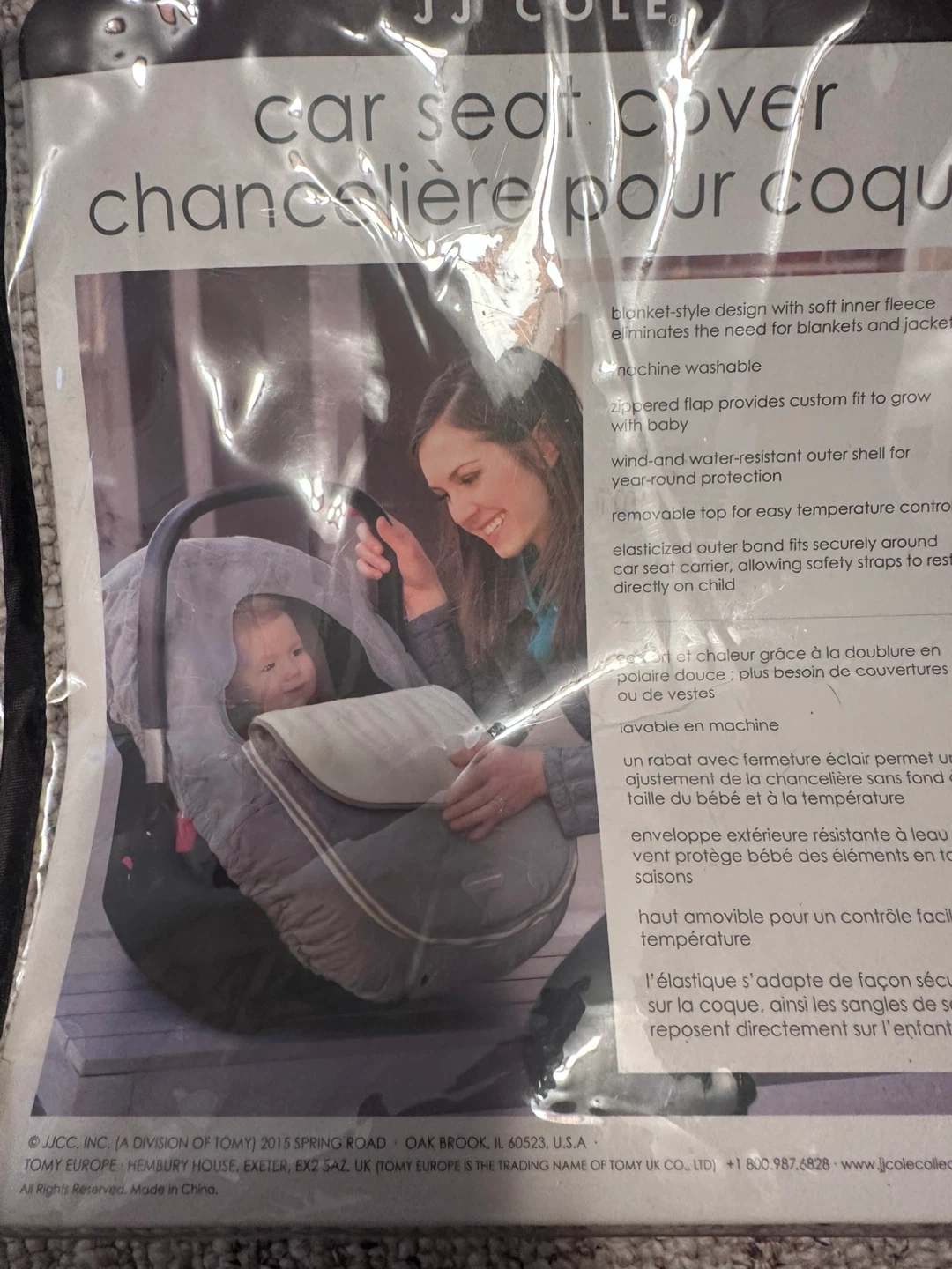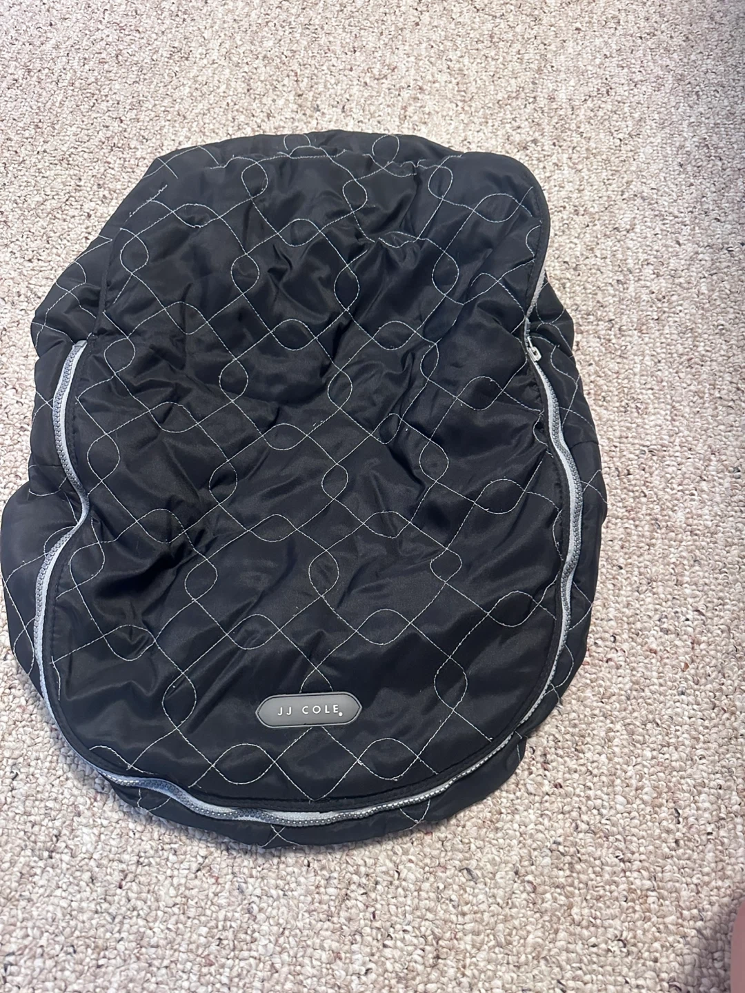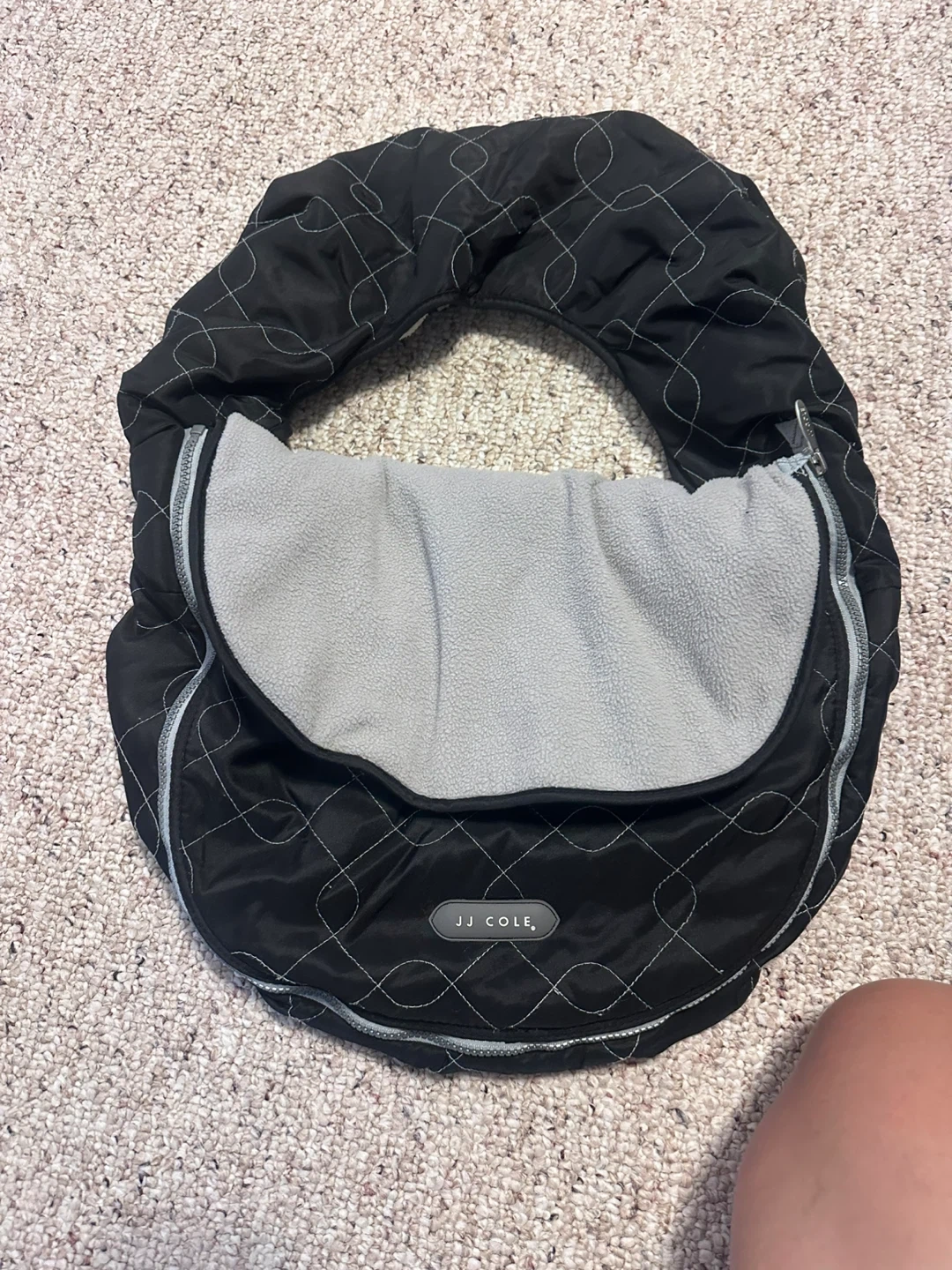I'm selling a JJ Cole car seat cover in black. It has a blanket-style design with soft inner fleece, eliminating the need for blankets and jackets. It's machine washable and has a zippered flap that provides a custom fit to grow with baby. The wind-and-water-resistant outer shell is great for year-round protection. It also has a removable top for easy temperature control