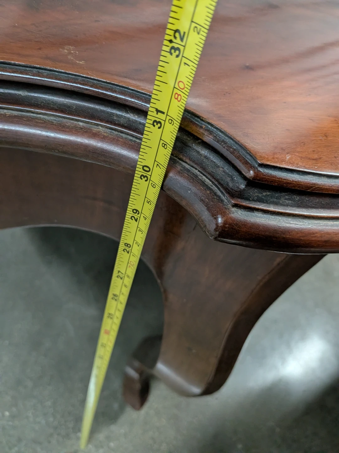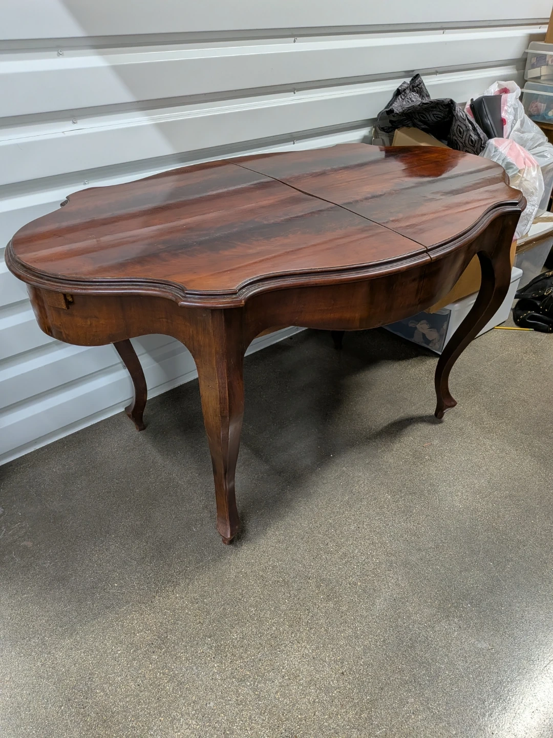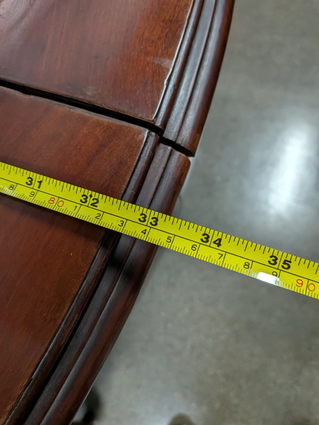 This vintage wooden table features a dark wood finish and ornate legs. Solid wood with the leaves stored underneath.Dimensions when opened: approximately 57 inches long by 35 inches wide. 31 height. Longer with the leaves placed.