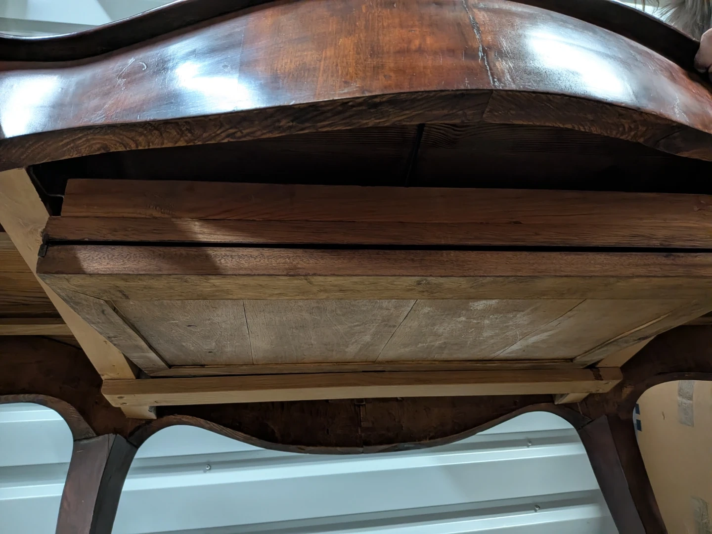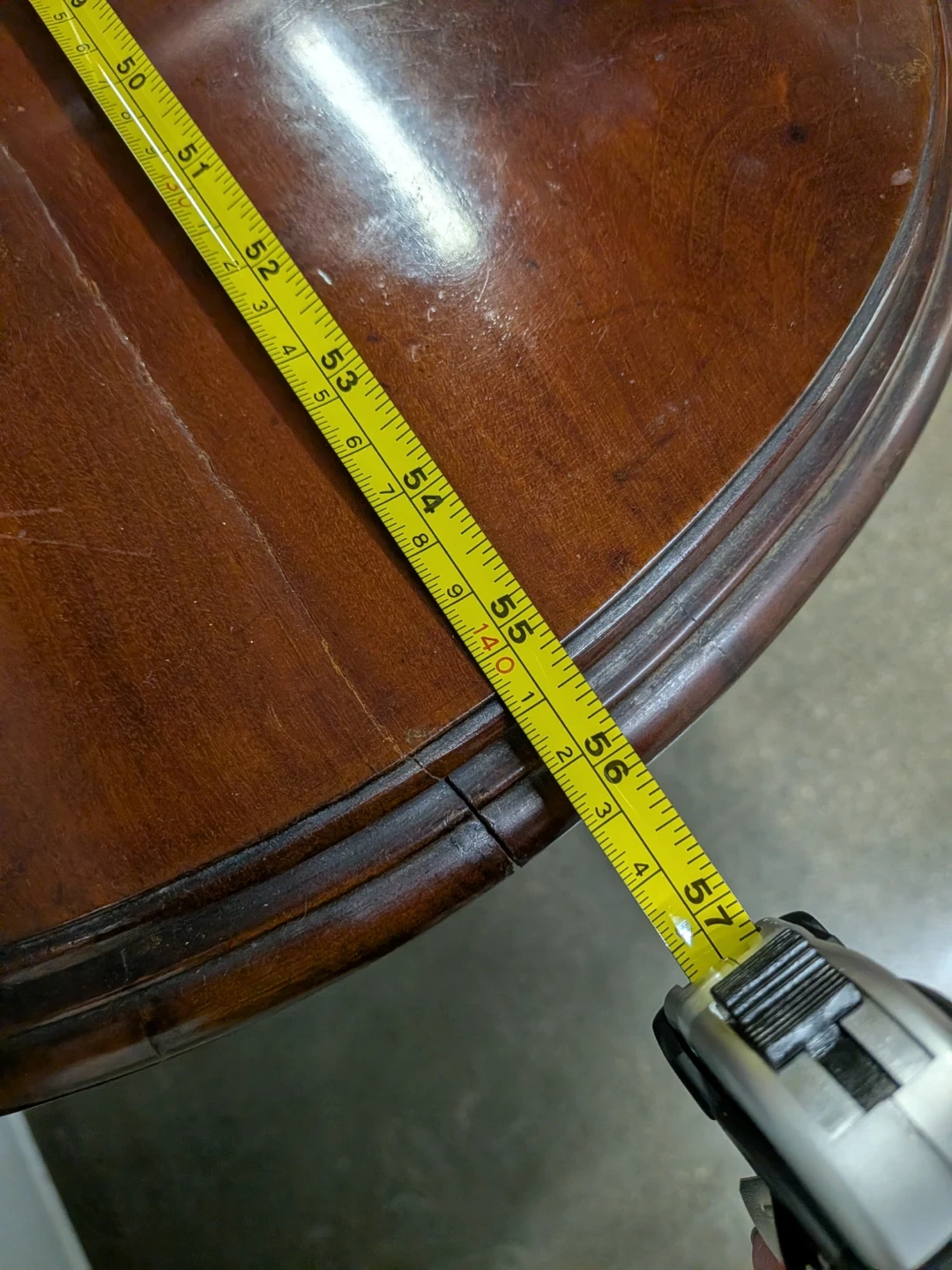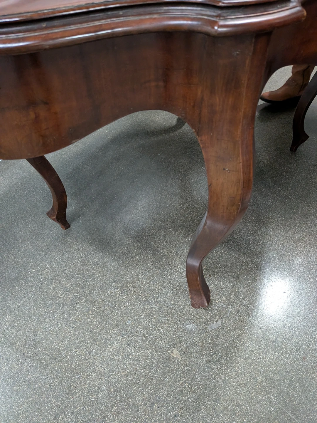 This vintage wooden table features a dark wood finish and ornate legs. Solid wood with the leaves stored underneath.Dimensions when opened: approximately 57 inches long by 35 inches wide. 31 height. Longer with the leaves placed.