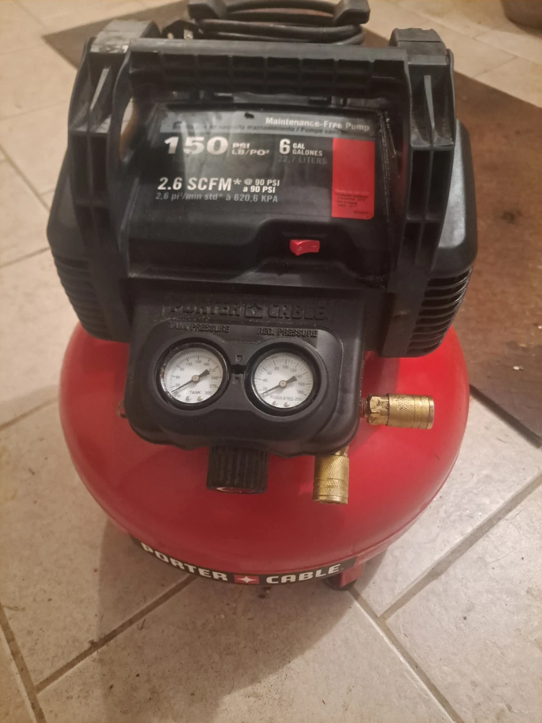 Porter-Cable 6-gallon air compressor with a maintenance-free pump. It has 150 PSI max pressure and 2.6 SCFM at 90 PSI. Tank pressure gauge and regulated pressure gauge included. This is useful for various DIY projects or inflating tires.