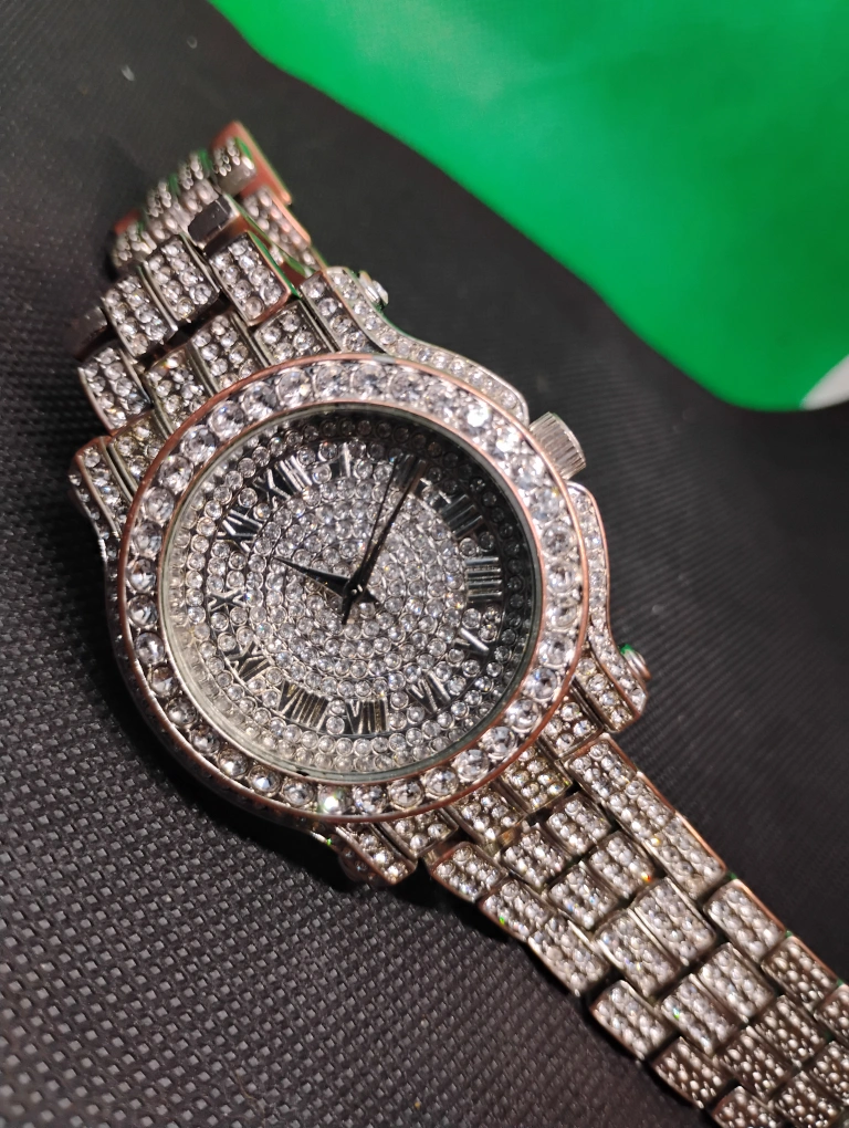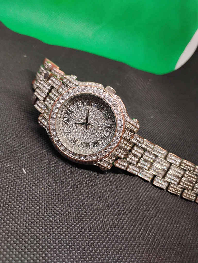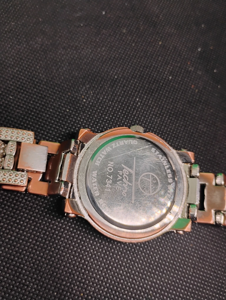 Stunning watch, rose gold and silver tone. Crystal-encrusted bezel and band. Quartz movement. Water resistant. Pre-owned. used well starting to fade in wrist side ! needs battery