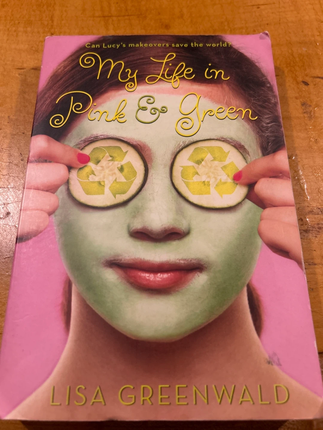 This is the book "My Life in Pink & Green" by Lisa Greenwald. It's part of a series about a character named Lucy. The cover features a person with a green face mask and cucumber slices on their eyes.