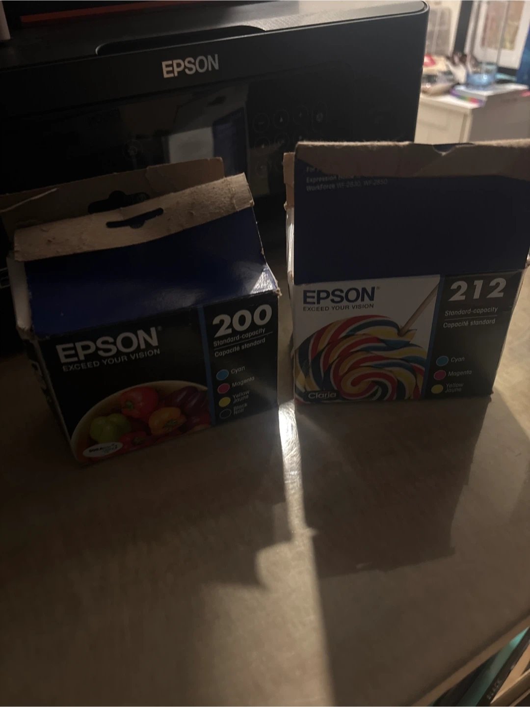 Selling two standard capacity Epson ink cartridges, one 200 and one 212. Both are Claria ink and compatible with Expression Home and Workforce printers. Colors included are Cyan, Magenta, Yellow, and Black. The 212 is still wrapped!