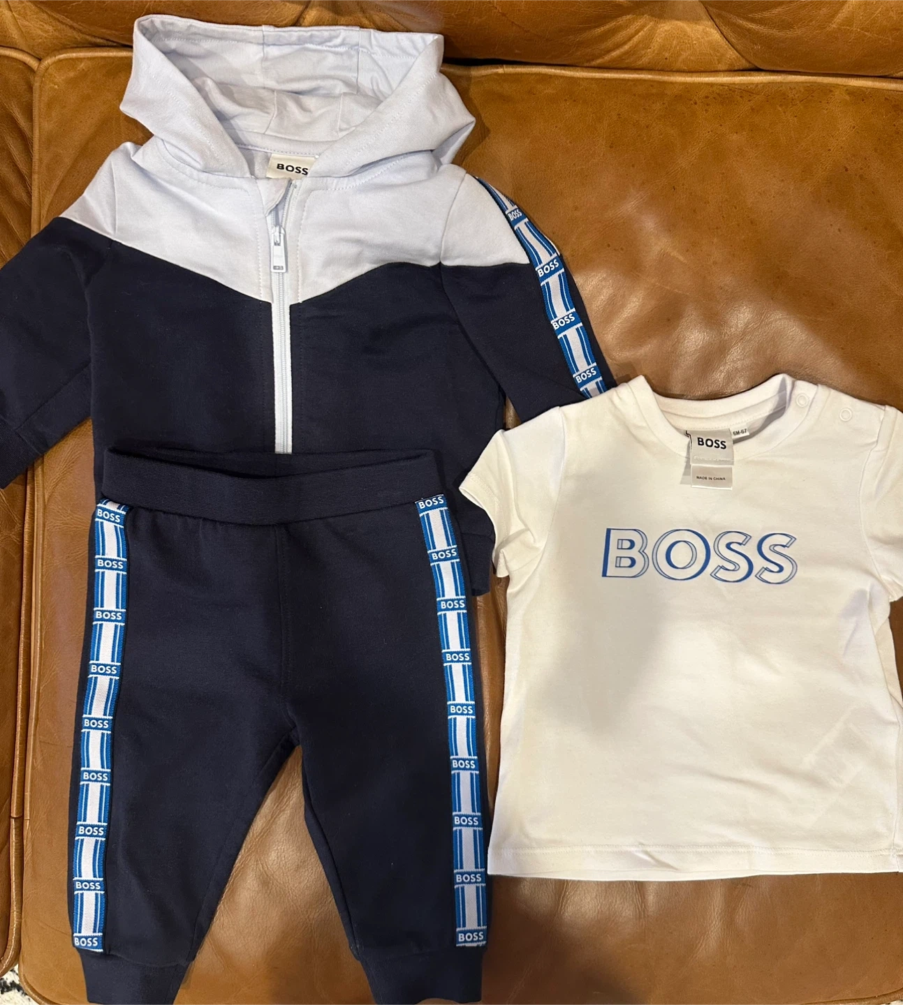This BOSS set includes a zip-up hoodie and matching pants with branded trim, plus a white t-shirt. It's size EM-67. The tracksuit features a color-block design in navy and light blue.