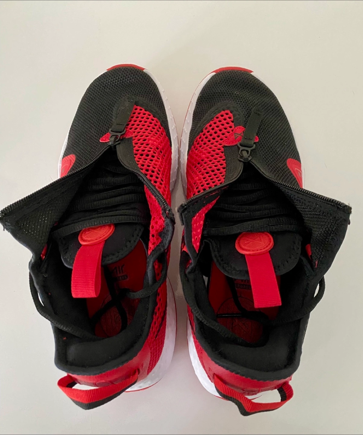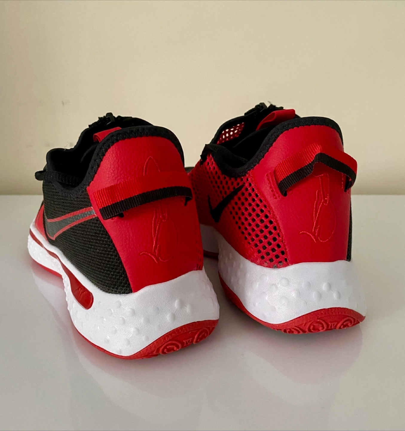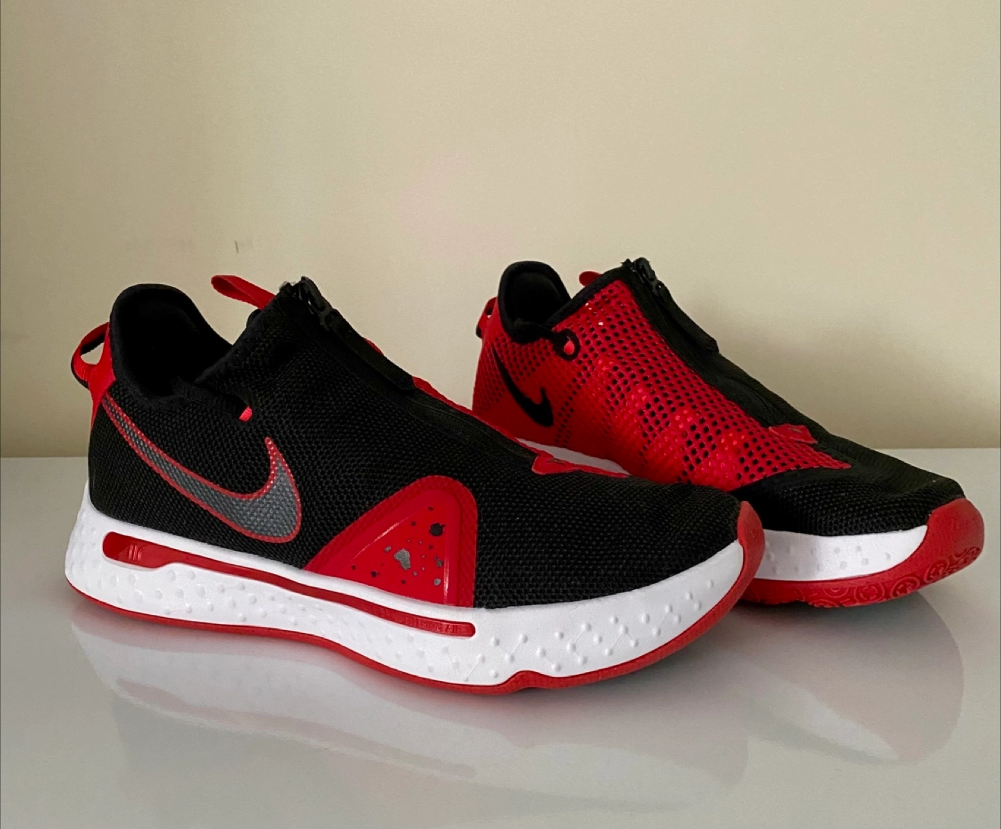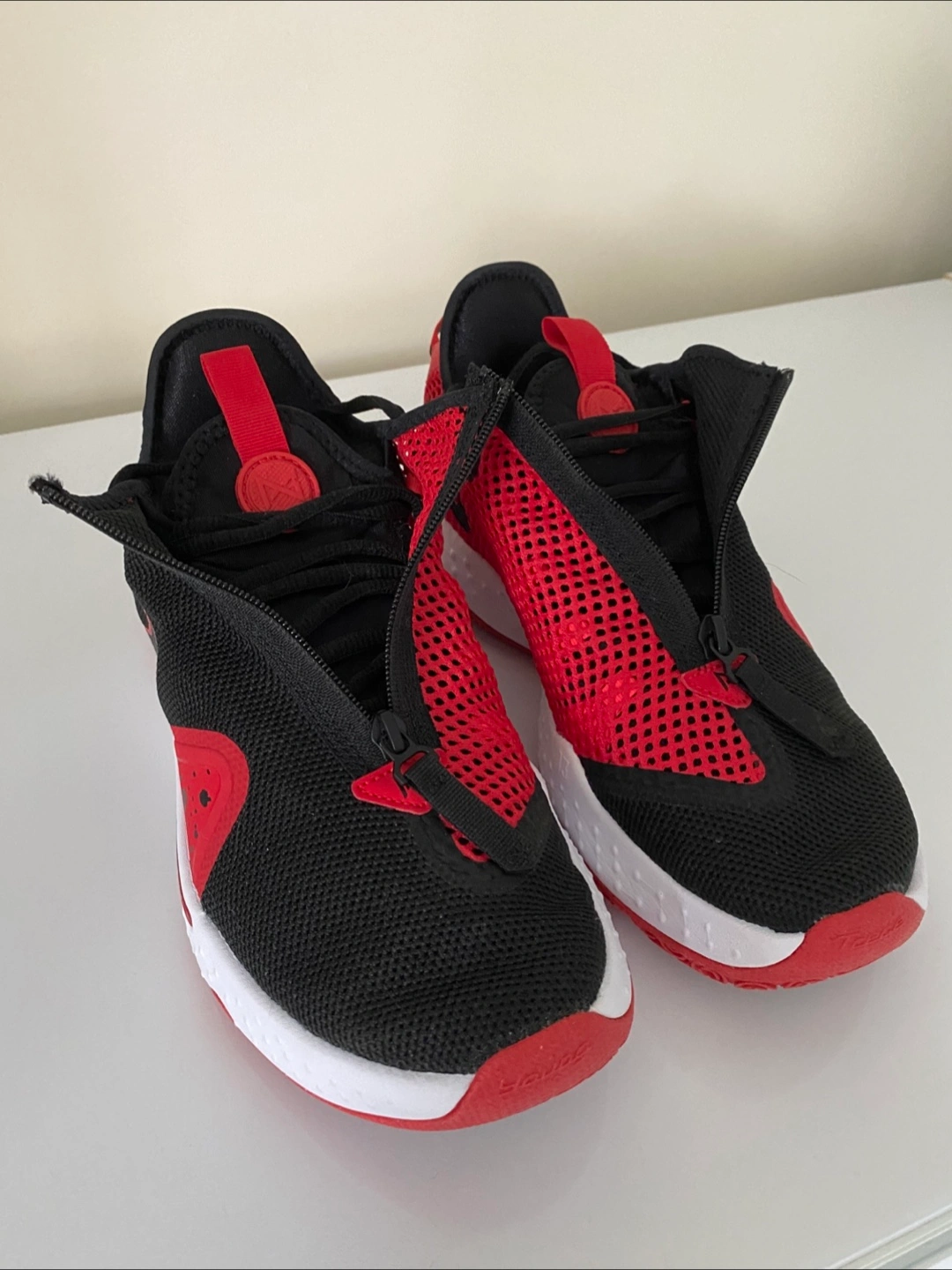 Selling a pair of Nike PG 4 basketball shoes in a striking black and red colorway. These shoes feature a unique zippered shroud for a secure fit and responsive cushioning for on-court performance. The design incorporates breathable mesh and supportive overlays, offering both comfort and stability. The durable outsole provides excellent traction, making them perfect for basketball or casual wear. Brand new! (Without box)