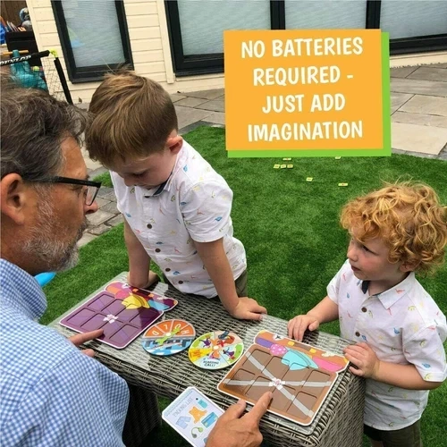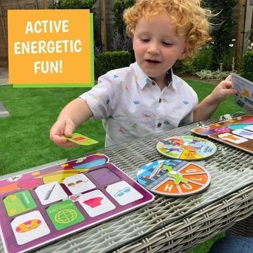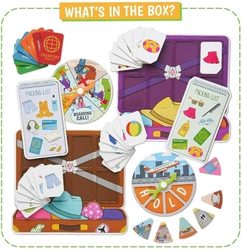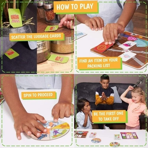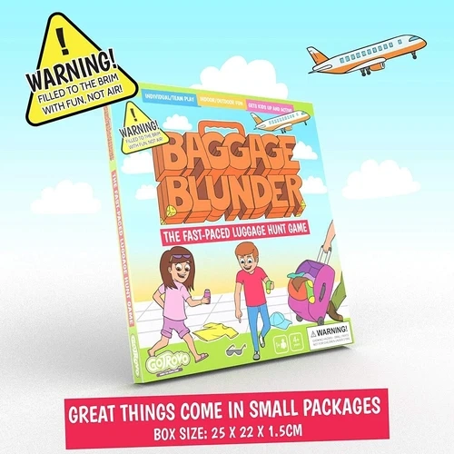 Baggage Blunder: A fast-paced luggage scavenger hunt board game for kids ages 4-8. This award-winning game of speed and chance is perfect for getting kids up and moving, sparking their imaginations without screens. It's versatile for various play styles: 2 players, a single player with a 'customs officer', or teams. Setup is quick – just scatter cards and let the fun begin! It's a race to find lost luggage and make the flight first, with unexpected twists like customs checks or flight delays. The game box is intentionally small to save space and resources. Includes: 2 Suitcase Puzzle Game Boards, 4 Packing Lists, 2 Spinner Boards with Spinner Mechanisms, 32 Lost Item Cards. Many ways to play: race individually, work together, play in relay teams, or have one child act as 'airport security'. Lots of running around and laughter guaranteed! Parents can also download an activity pack for coloring and travel-themed creative play. Feel free to message if you have any questions!