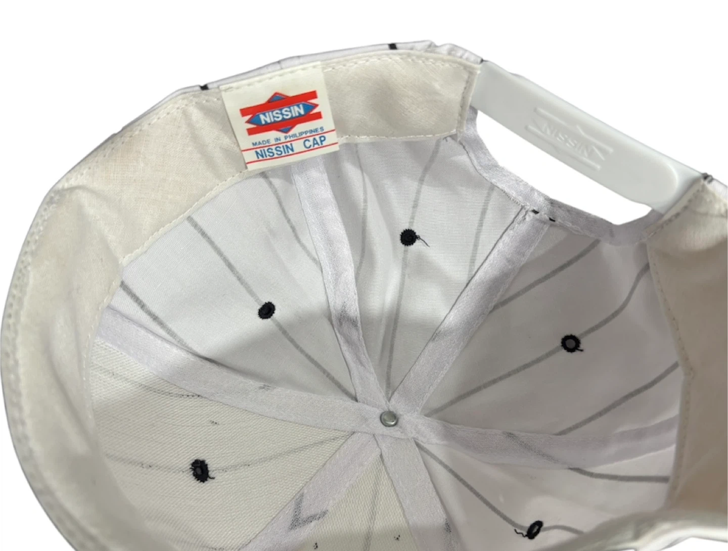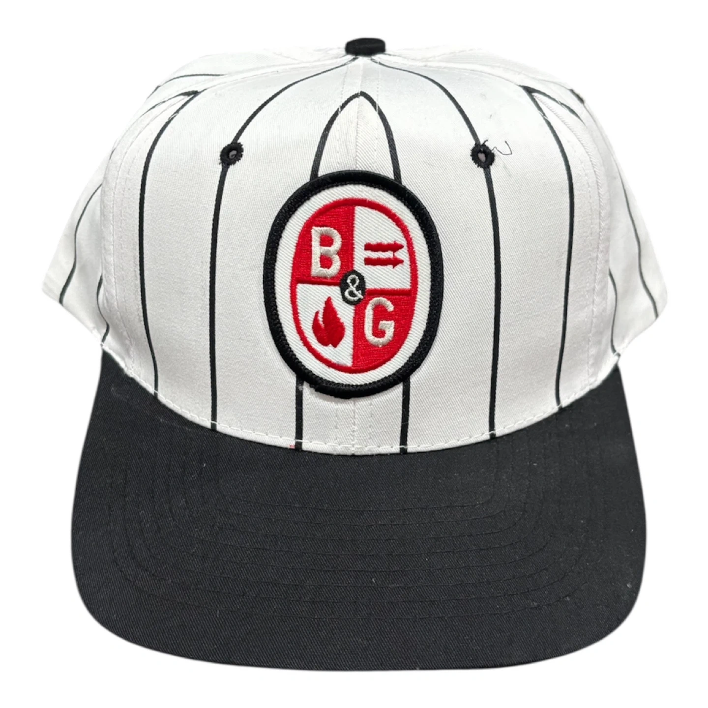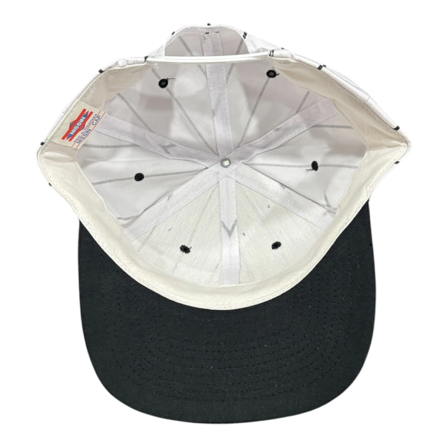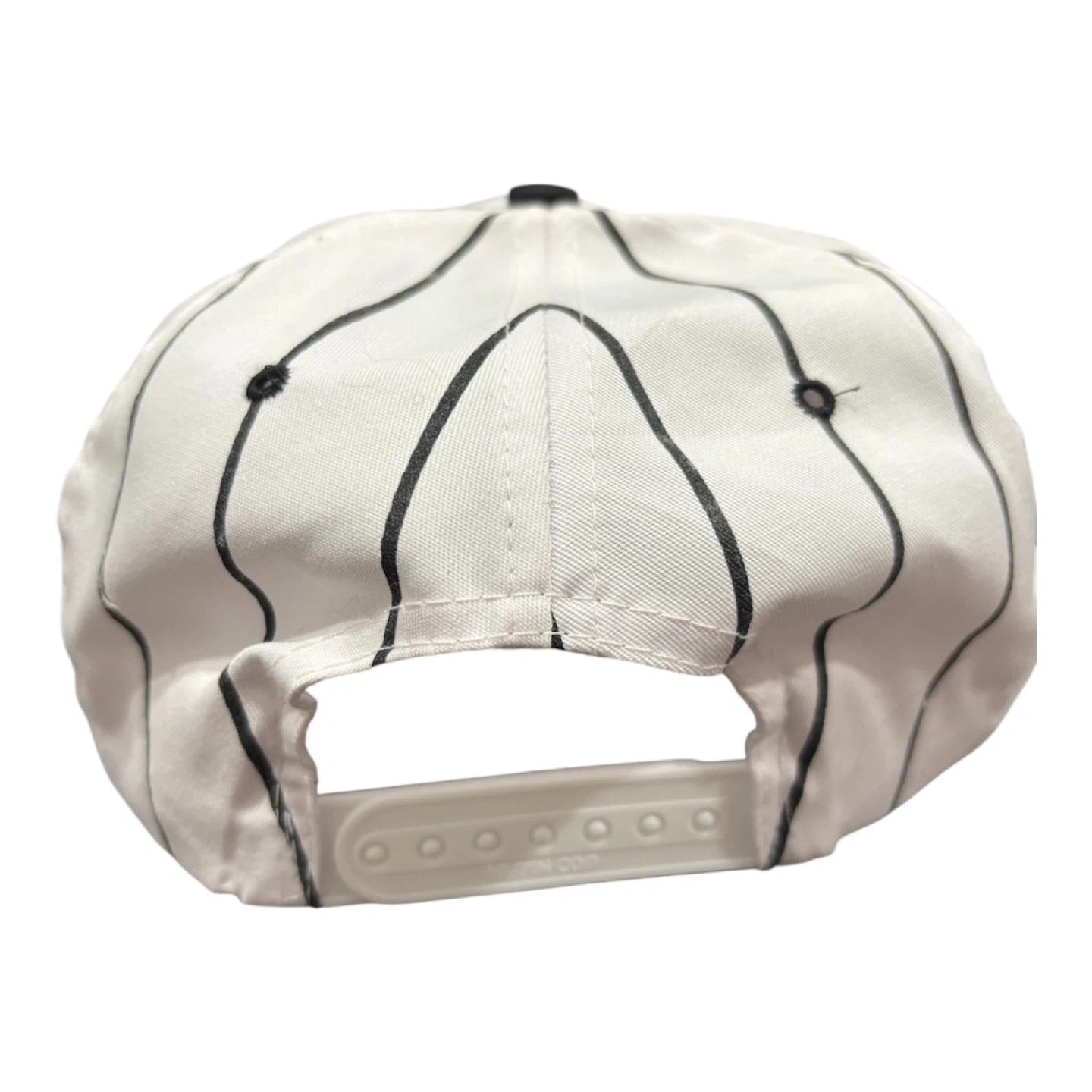 Classic pinstripe snapback hat from NISSIN. Features a black brim and adjustable strap. Made in the Philippines.