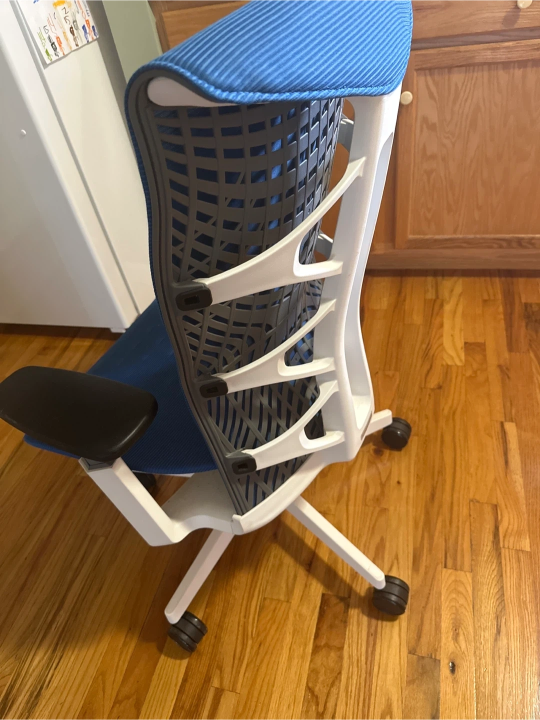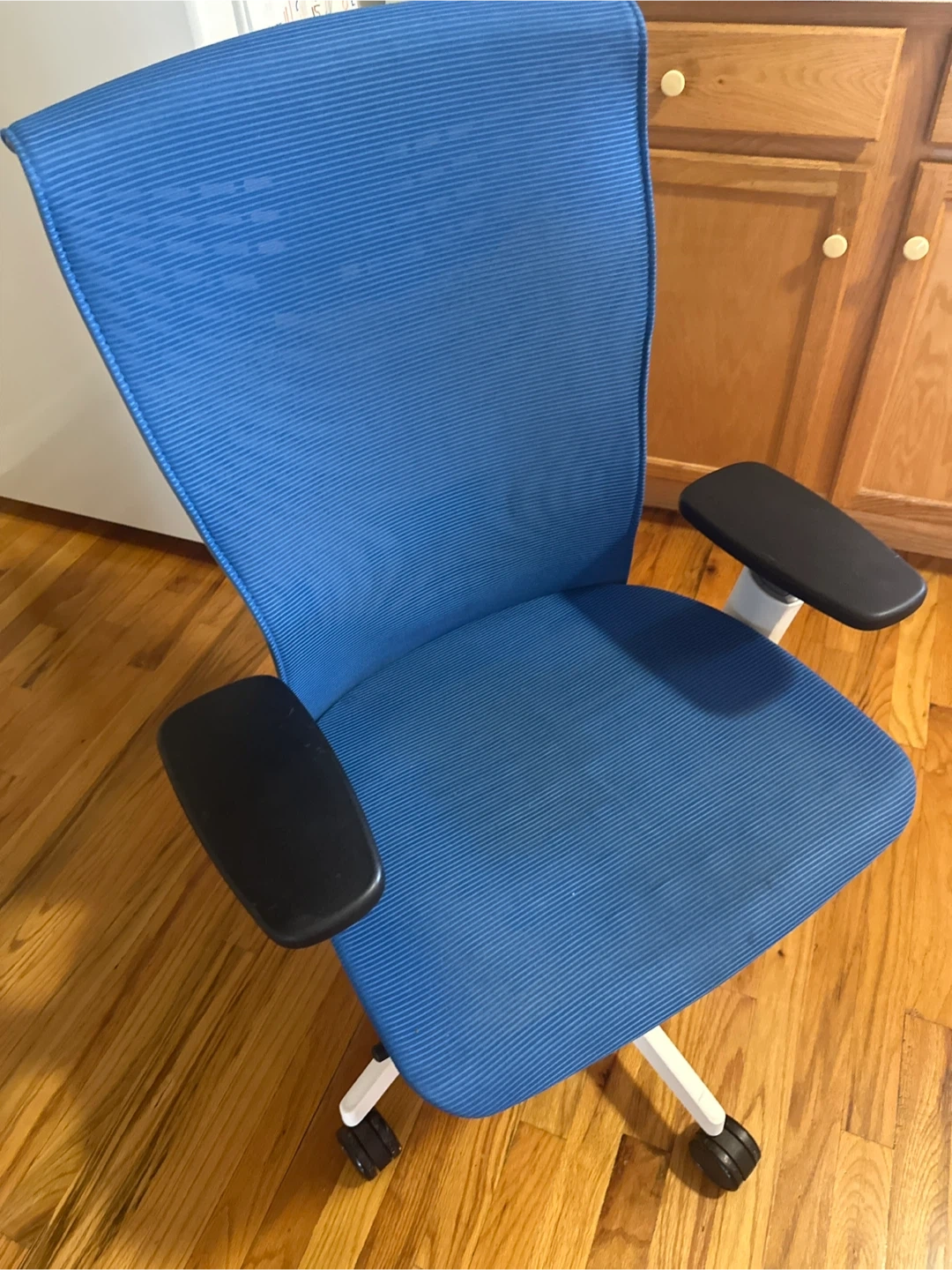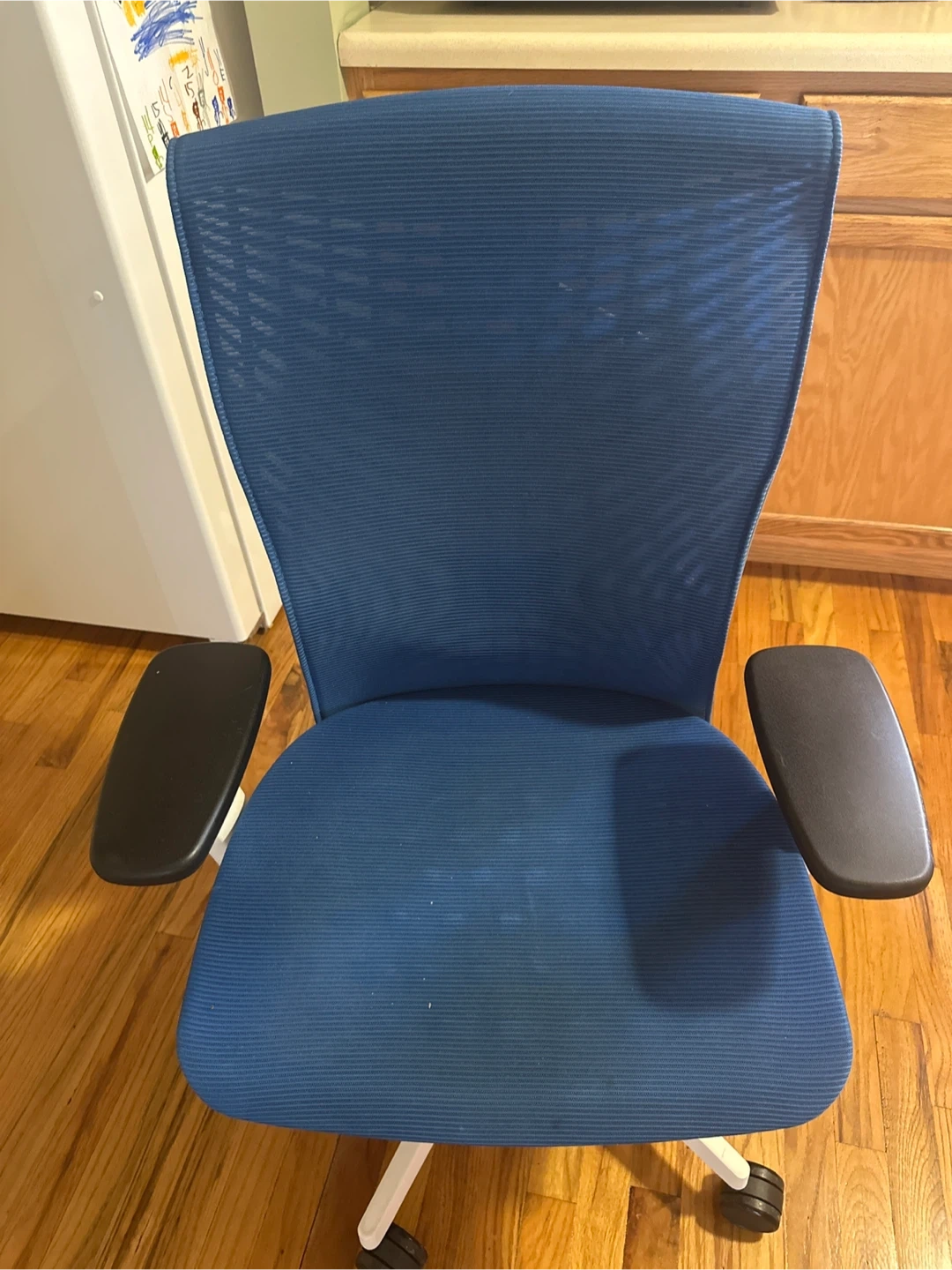 This is a blue ergonomic office chair with a mesh back and padded seat. It features adjustable armrests and a white base with wheels. It's designed for comfortable seating.