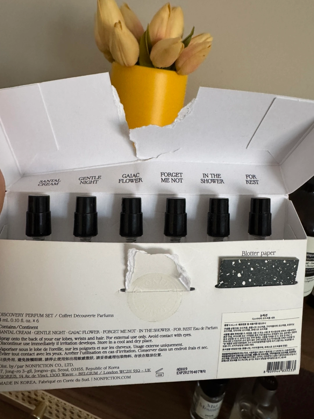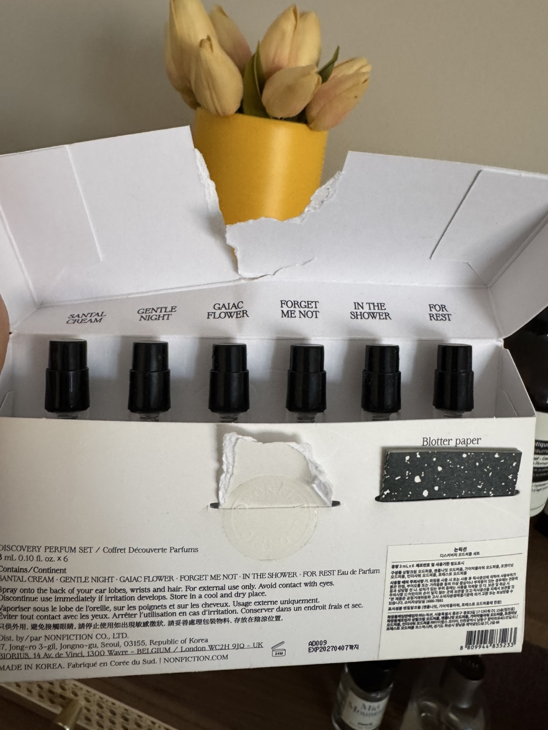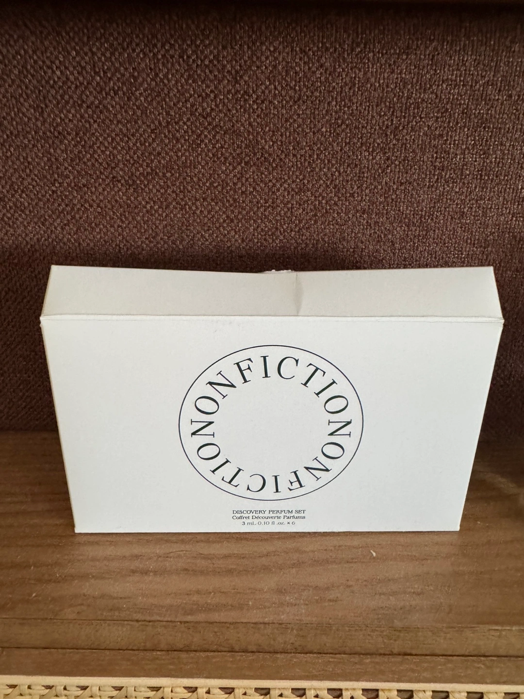 Selling a NONFICTION Discovery Perfume Set! It includes six 3ml perfumes: Santal Cream, Gentle Night, Gaiac Flower, Forget Me Not, In The Shower, and For Rest. Also comes with blotter paper. Perfect for discovering your favorite scent!