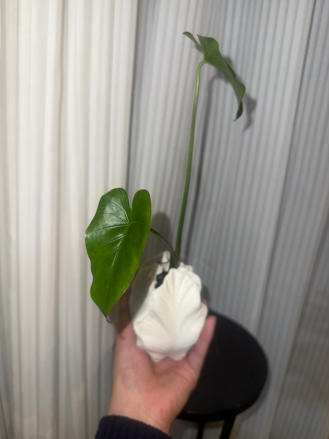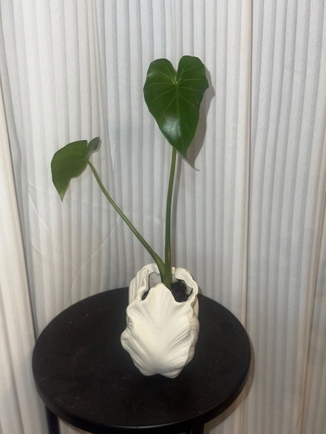 114I'm selling a cute mini size alocasia elephant ear plant in a unique white shell-shaped vase! It's a great addition to any room and adds a touch of nature to your home