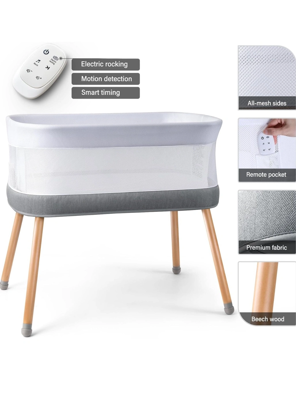 Bassinet with wooden legs. Features electric rocking and smart timing. All-mesh sides. There's a remote pocket and it has premium fabric. The beech wood adds a nice touch. A perfect place for your little one to sleep soundly. NEW IN BOX