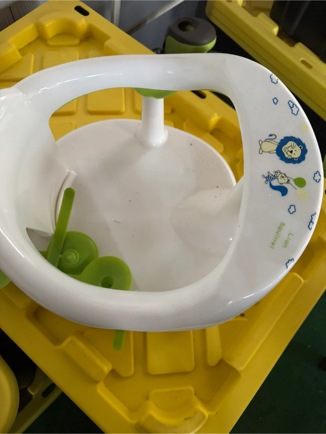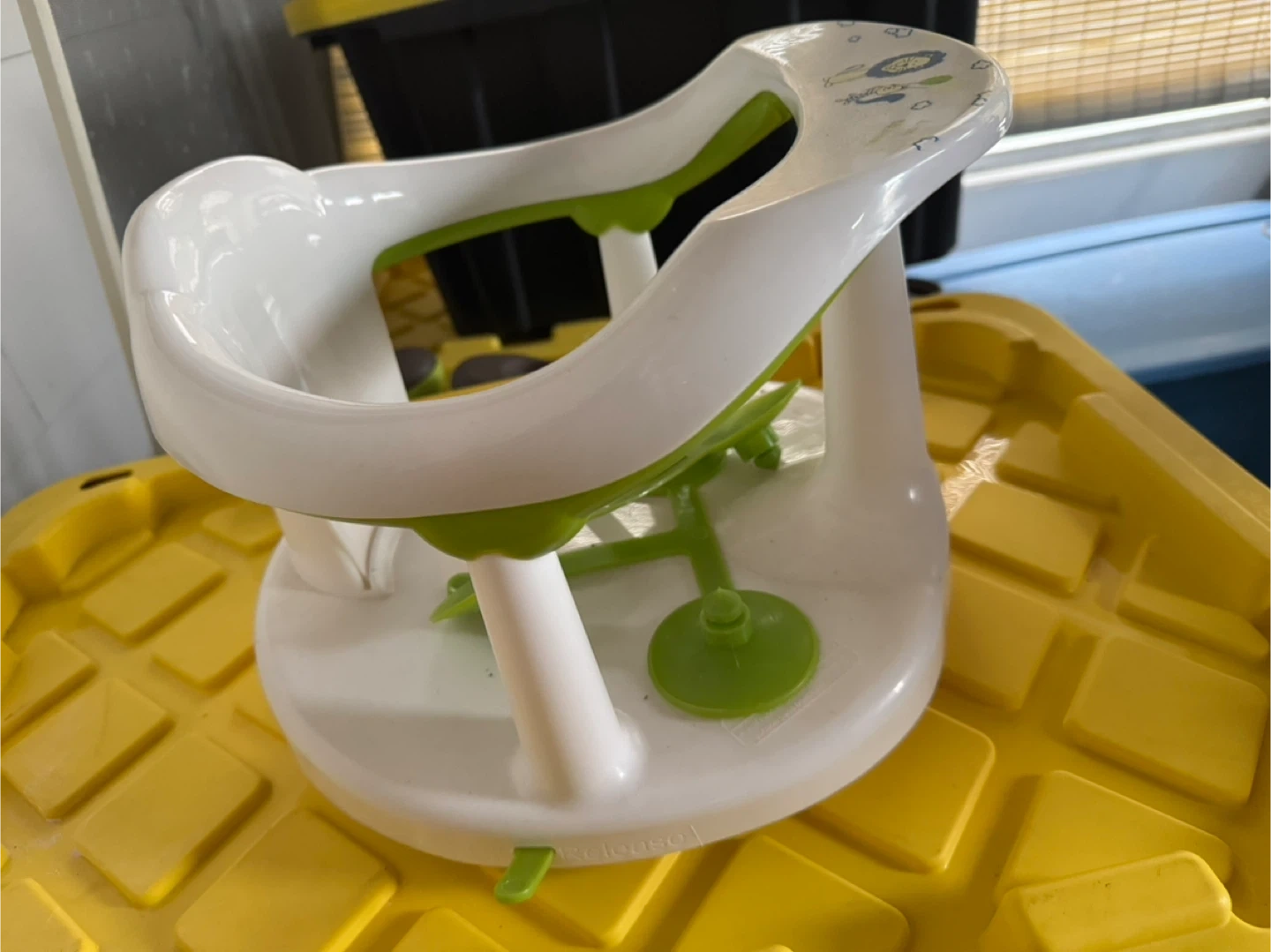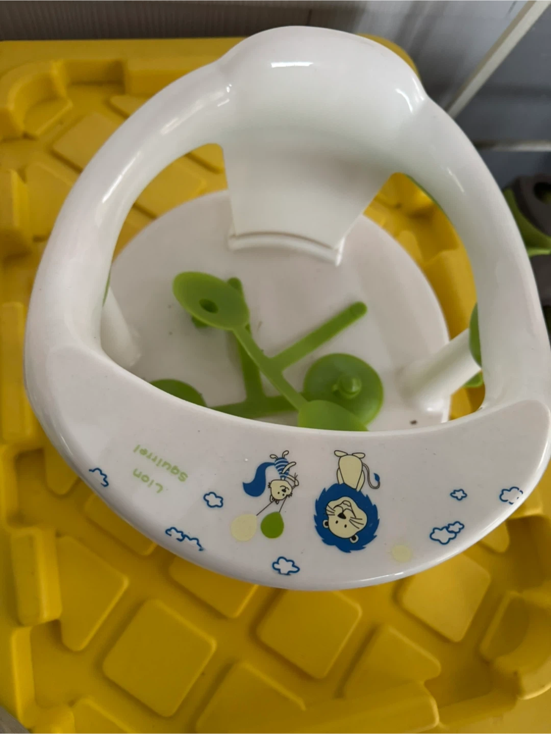 36Selling a baby bath seat in good condition. It's white and green with suction cups on the bottom to keep it secure in the tub. It has a cute lion and squirrel design on the front
