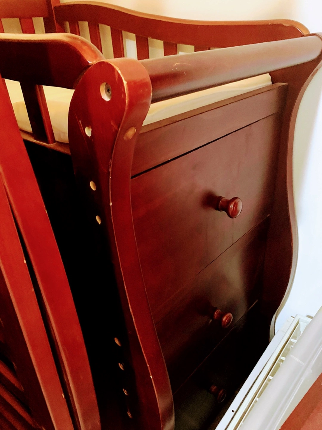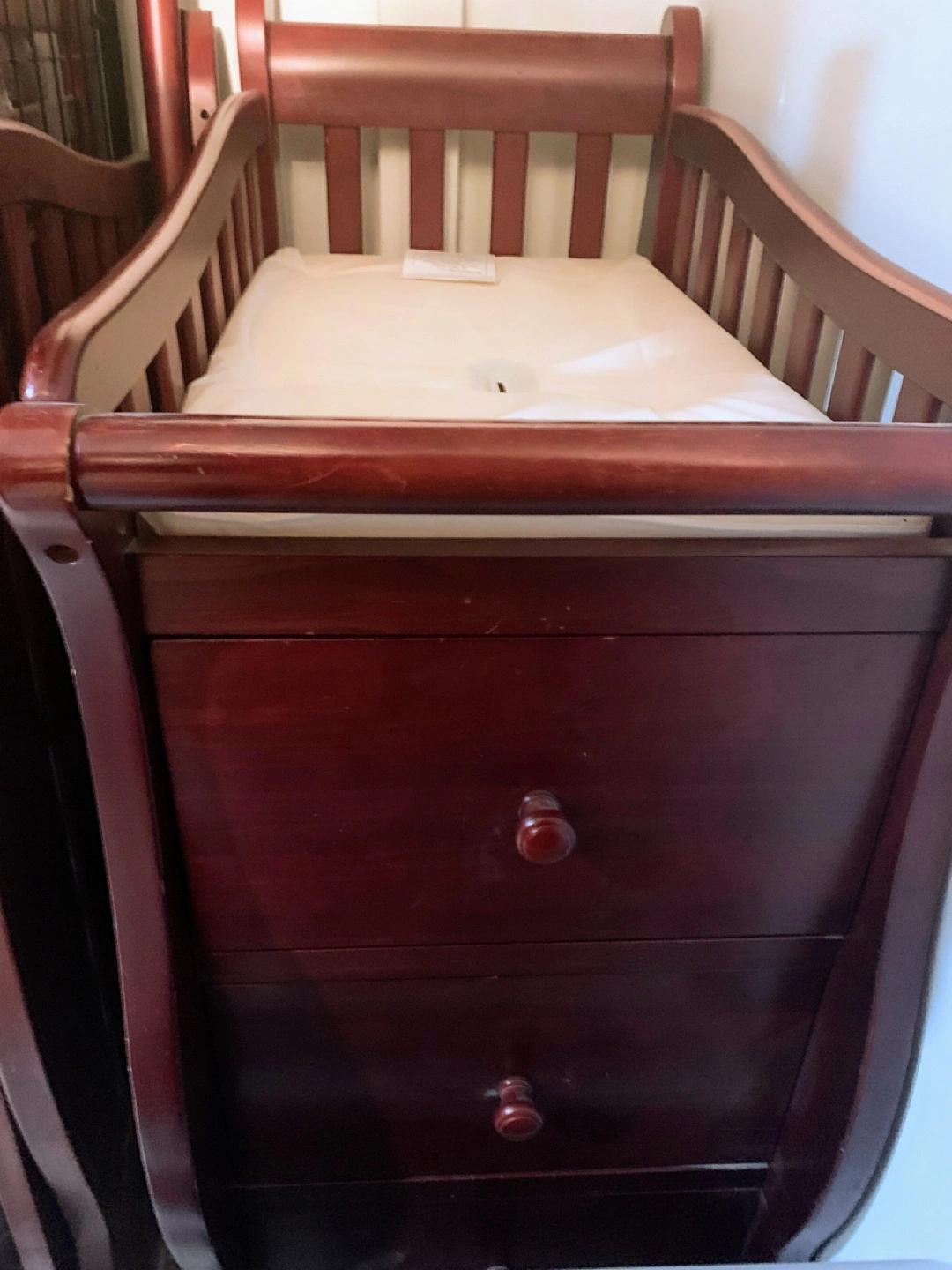 Wooden changing table with drawers. Has a changing pad and rails. Solid color. A great item for creating a peaceful nursery experience.