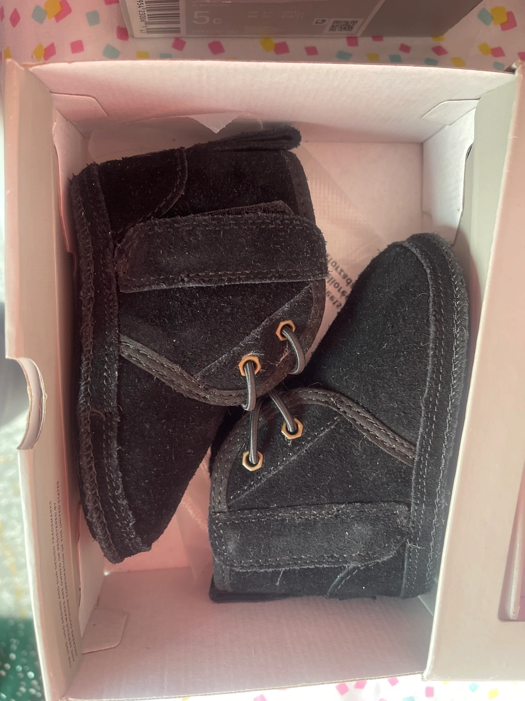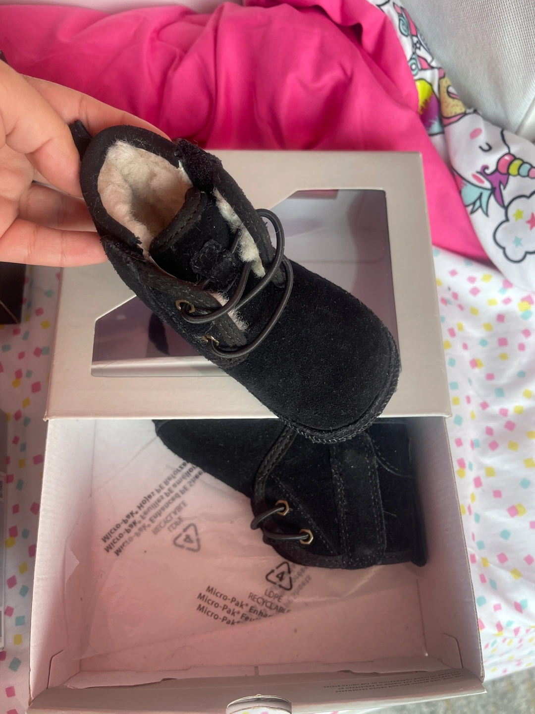 55These baby boots are made of black suede with a fleece lining and laces. They are in excellent condition. Size 2/3