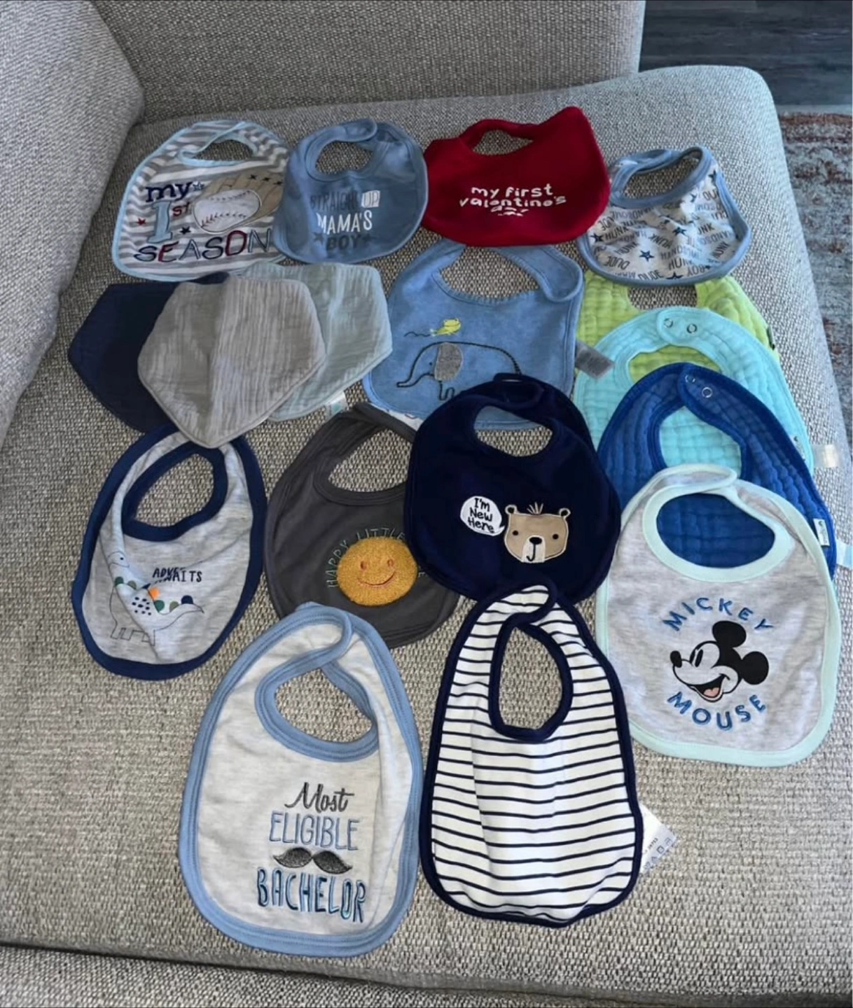 Assortment of baby bibs. Various designs and colors. Great for keeping babies clean and tidy. Unused, new! Smoke free, pet free home.