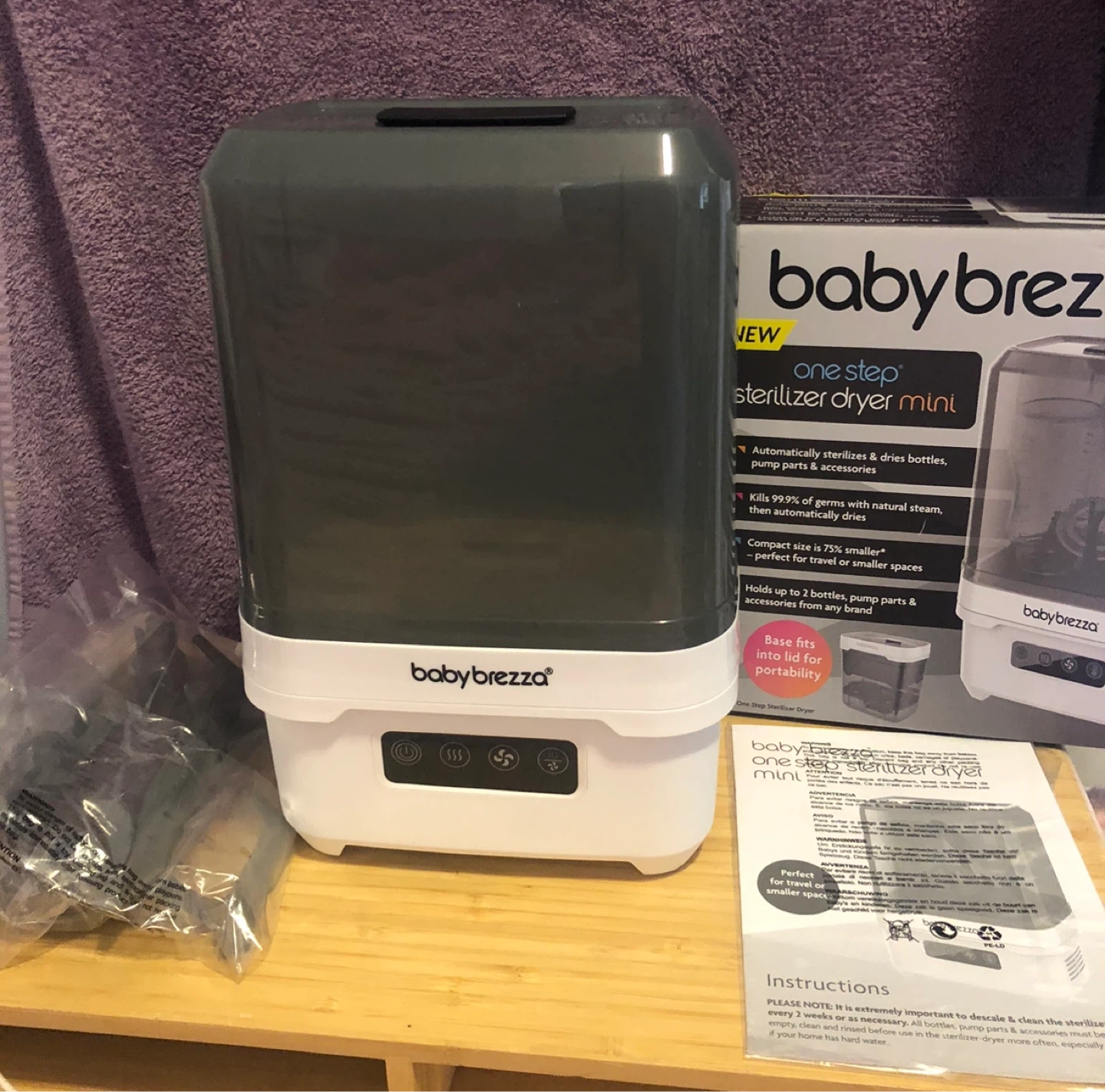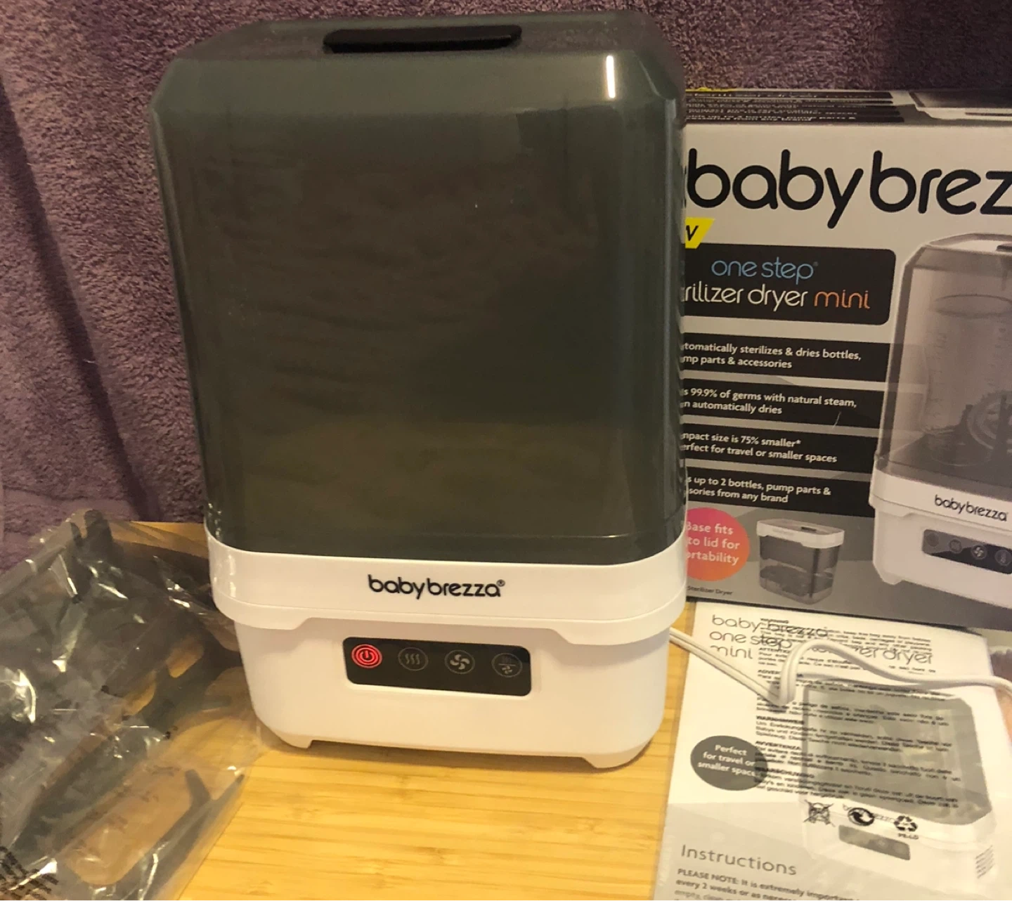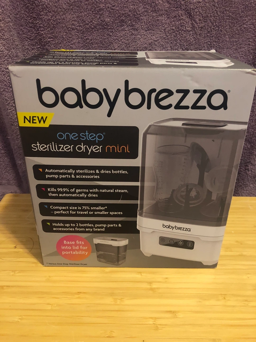 Selling a Baby Brezza One Step Sterilizer Dryer Mini. This compact sterilizer dryer automatically sterilizes and dries bottles, pump parts, and accessories. It kills 99.9% of germs with natural steam, then automatically dries with hot air. It is perfect for travel or smaller spaces and holds up to 2 bottles, pump parts & accessories from any brand. Base fits into lid for portability. Includes instructions and original packaging!