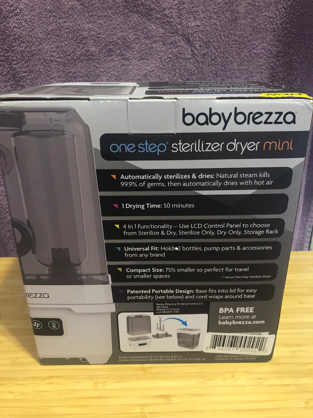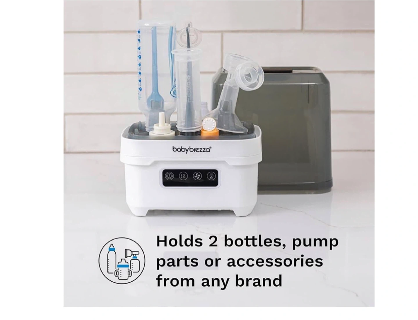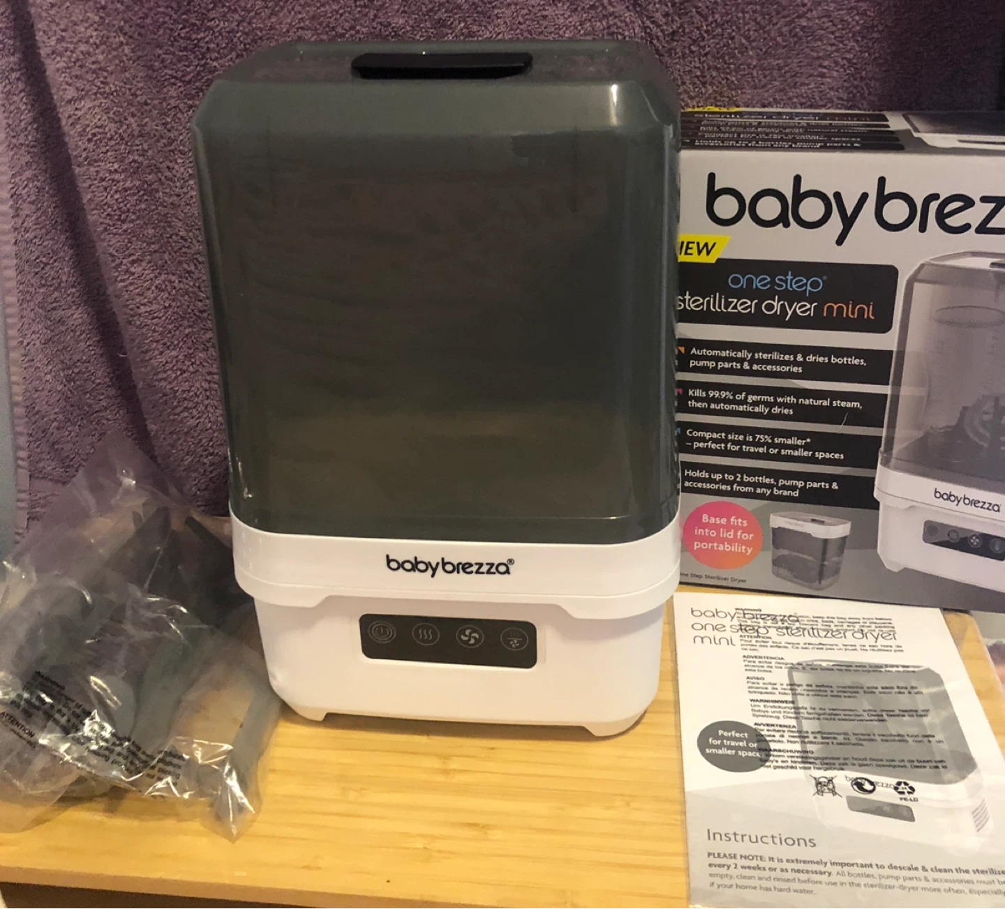 Selling a Baby Brezza One Step Sterilizer Dryer Mini. This compact sterilizer dryer automatically sterilizes and dries bottles, pump parts, and accessories. It kills 99.9% of germs with natural steam, then automatically dries with hot air. It is perfect for travel or smaller spaces and holds up to 2 bottles, pump parts & accessories from any brand. Base fits into lid for portability. Includes instructions and original packaging!