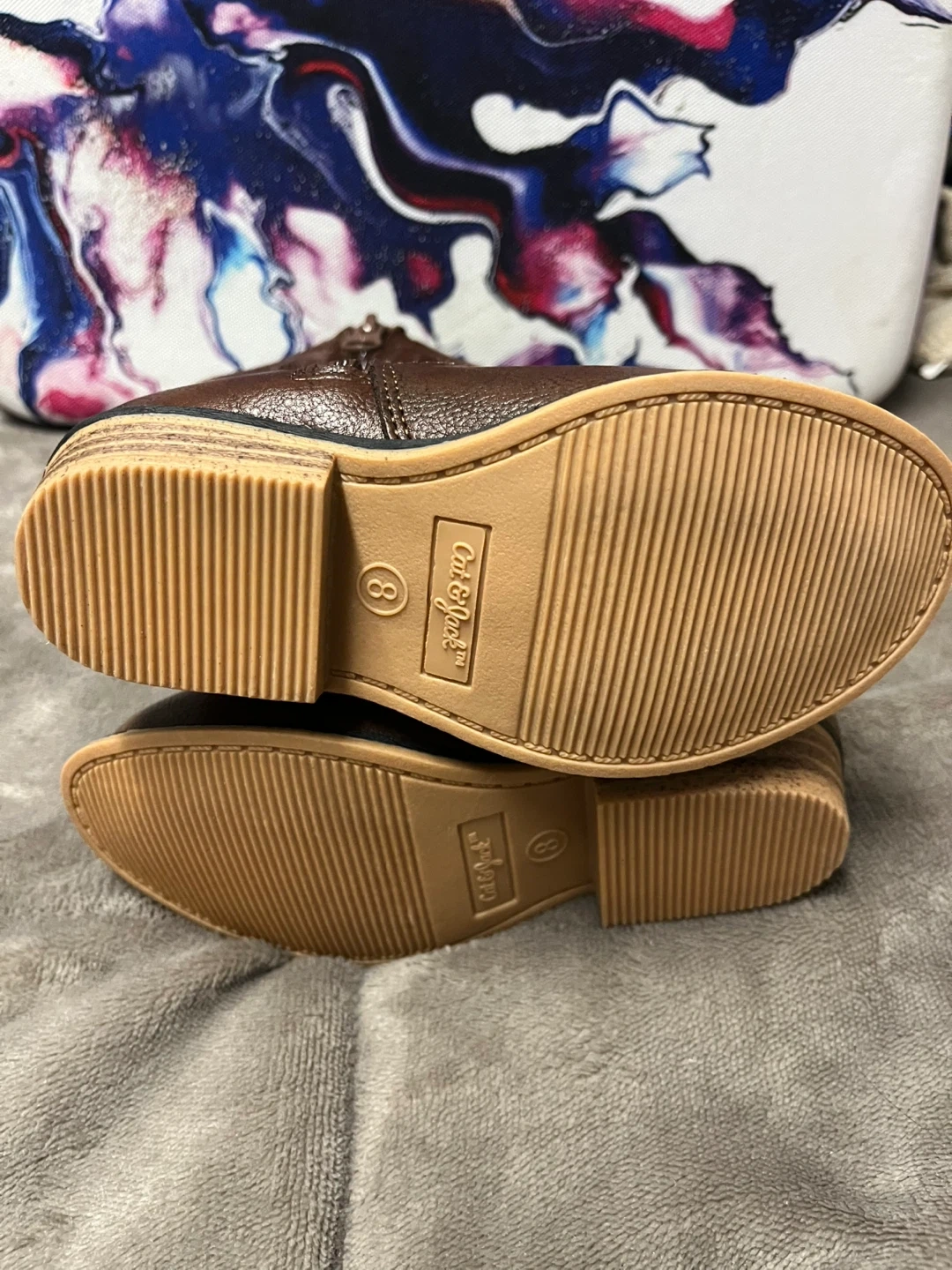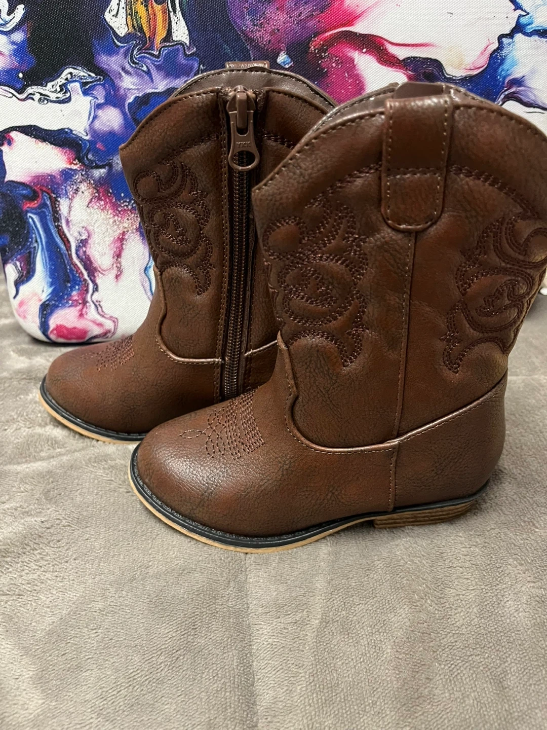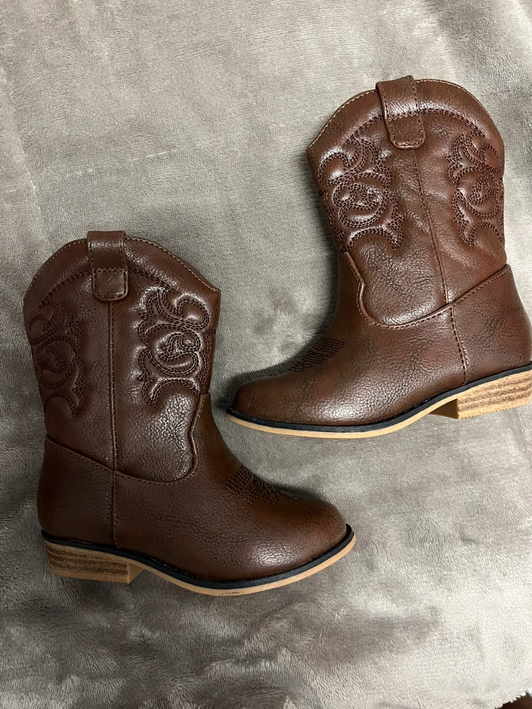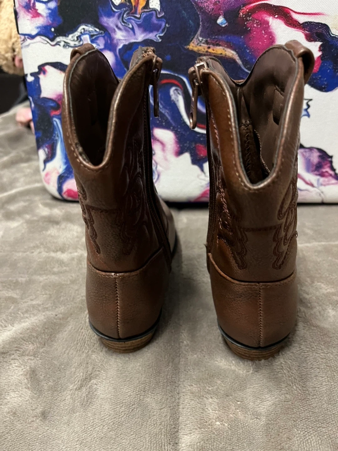 60Selling a New pair of Cat & Jack cowboy boots in size 8. They're a cute brown color and have a fun design on the sides. Perfect for your little one!
