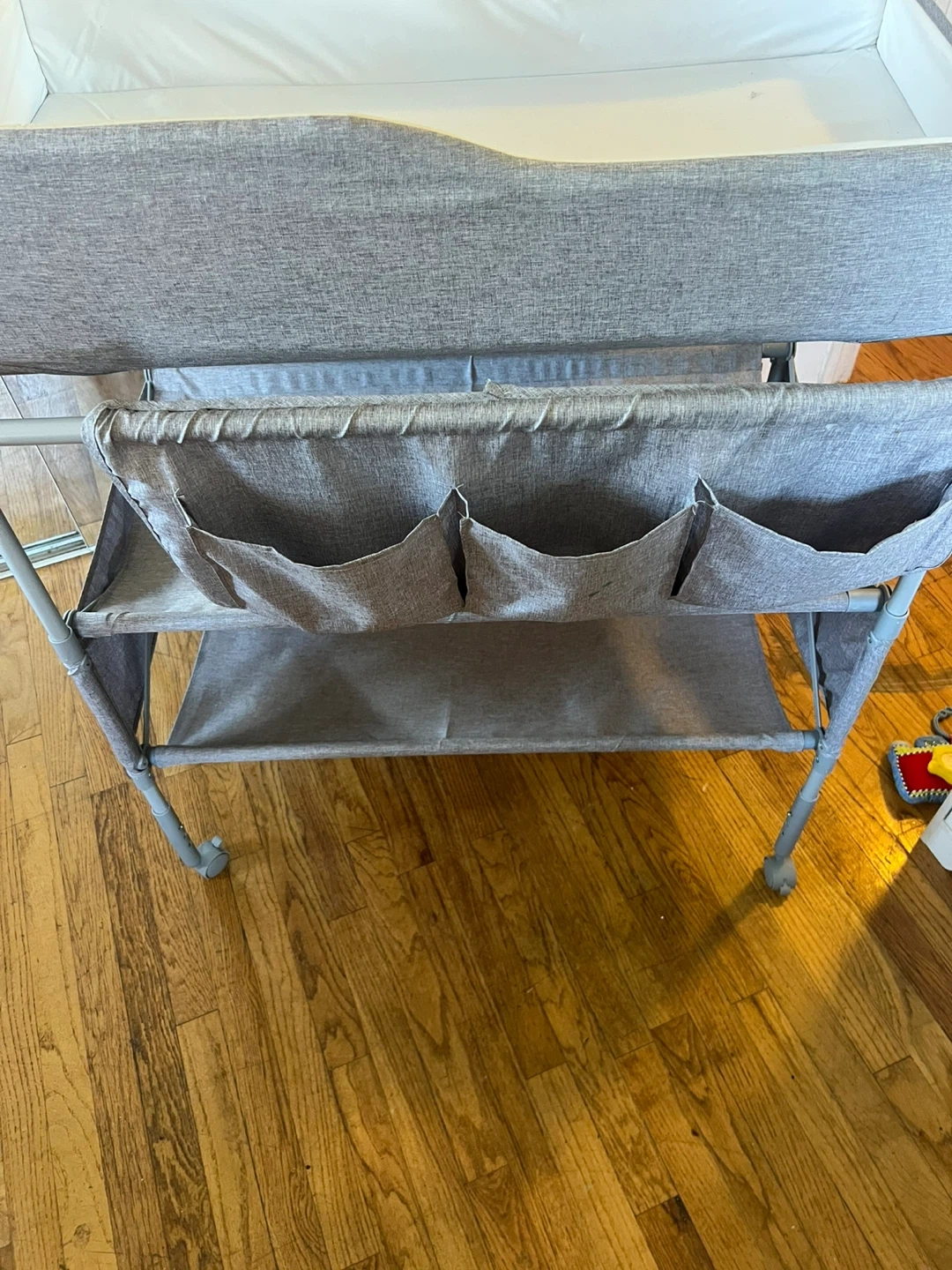 60Selling a baby changing table in gray. It has a padded area on top and storage underneath for diapers, wipes, and other baby essentials. There are some minor signs of use, but it's still in good condition and ready for a new home!