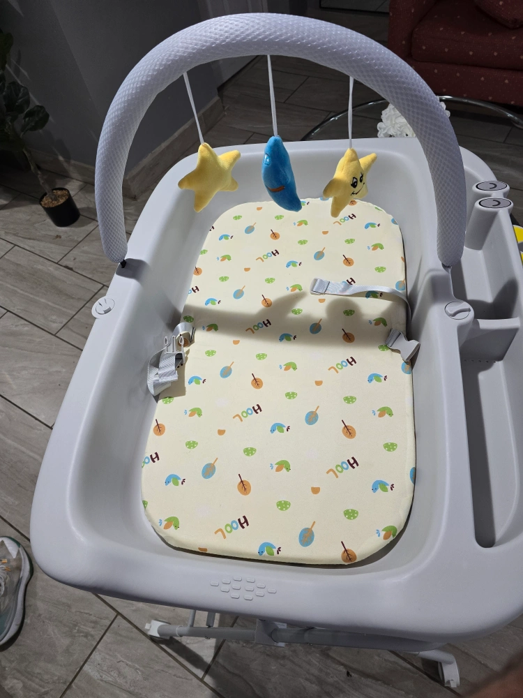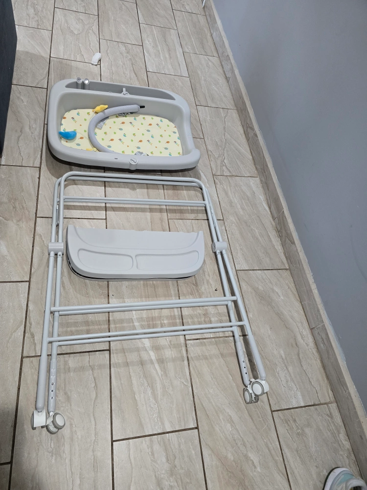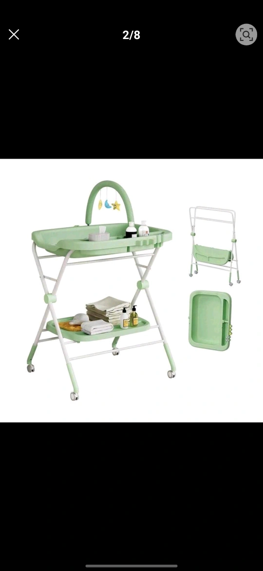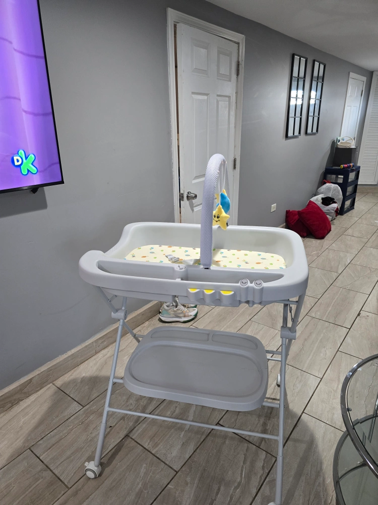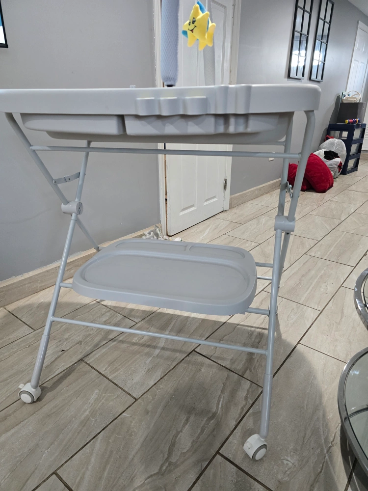 15I'm selling a baby changing table with a built-in bathtub. It's in perfect condition and has a wheeled structure for easy movement. The changing table is comfortable and easy to clean. It also has a lower shelf for storing diapers, wipes, and other baby essentials. My baby cried a lot when I tried to put him there, so we didn't use it much.