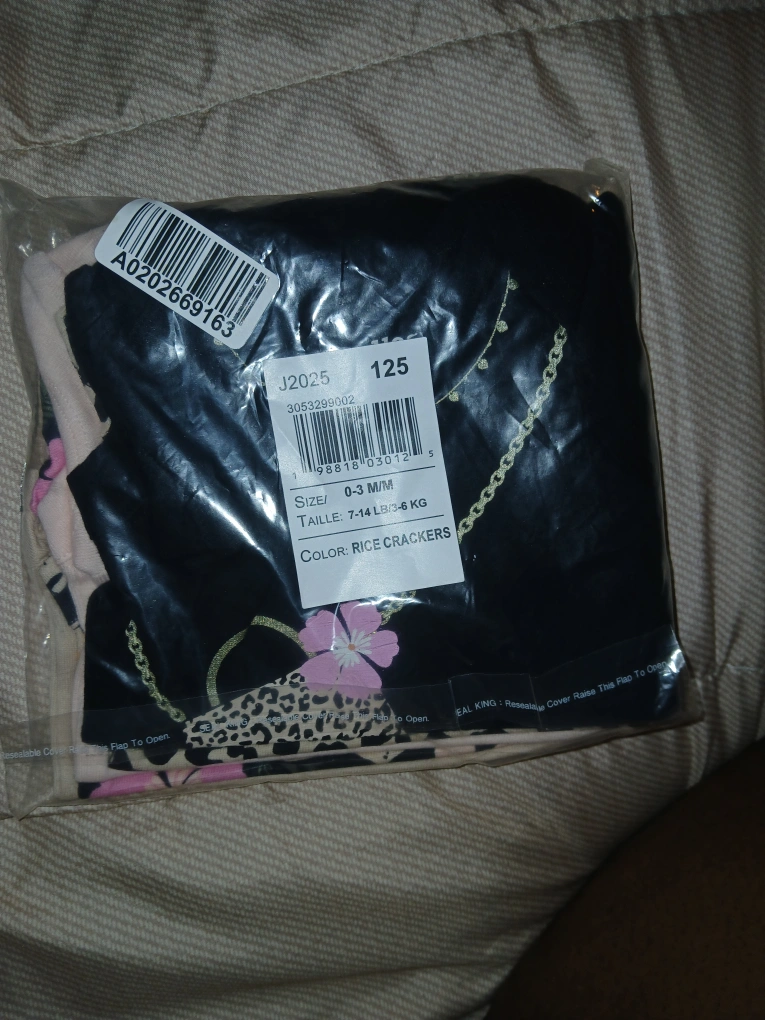 Selling baby clothes, size 0-3 months. The color is 'Rice Crackers' and the size is for babies 7-14 lbs or 3-6 kg