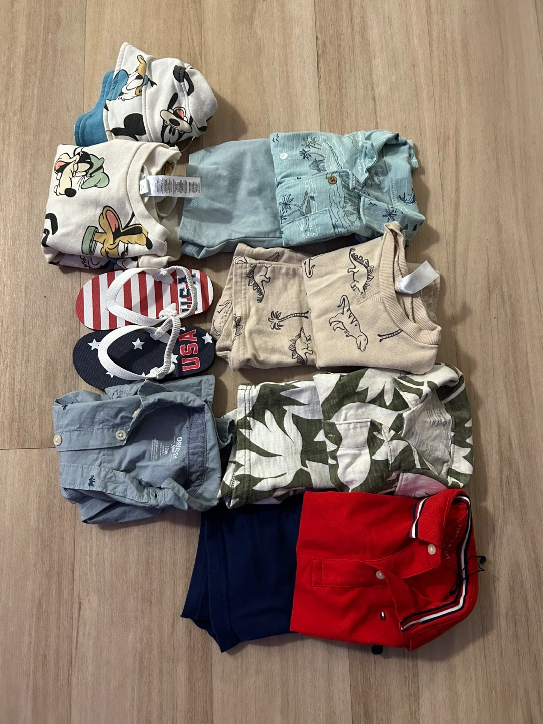 Selling a bundle of baby clothes in various styles and brands! Includes shirts, shorts, and a pair of flip-flops. Great for mixing and matching! Good price