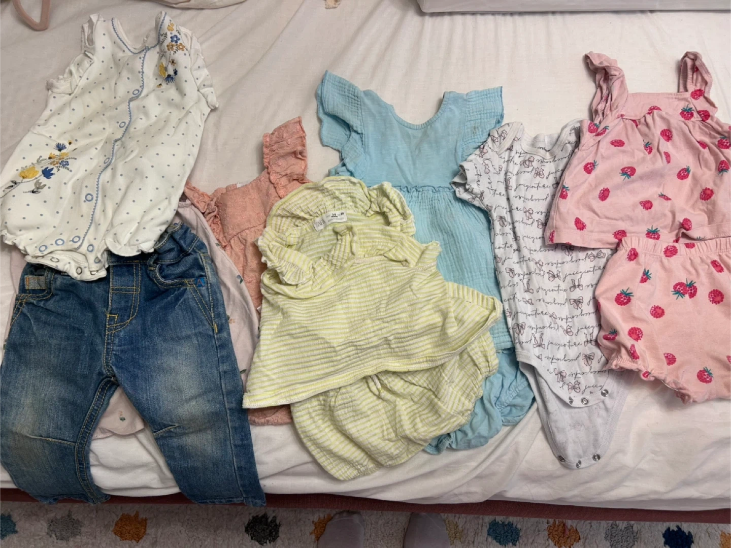 Selling a mixed bundle of baby clothes. There's a variety of items, including onesies, shirts, pants, and dresses. Sizes and brands vary, so please take a look at the pictures for details!