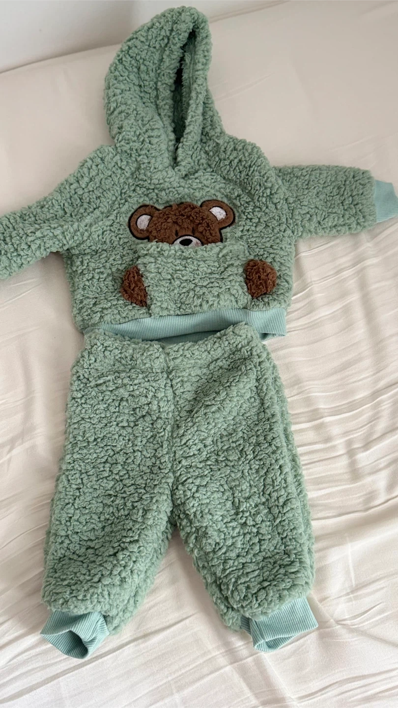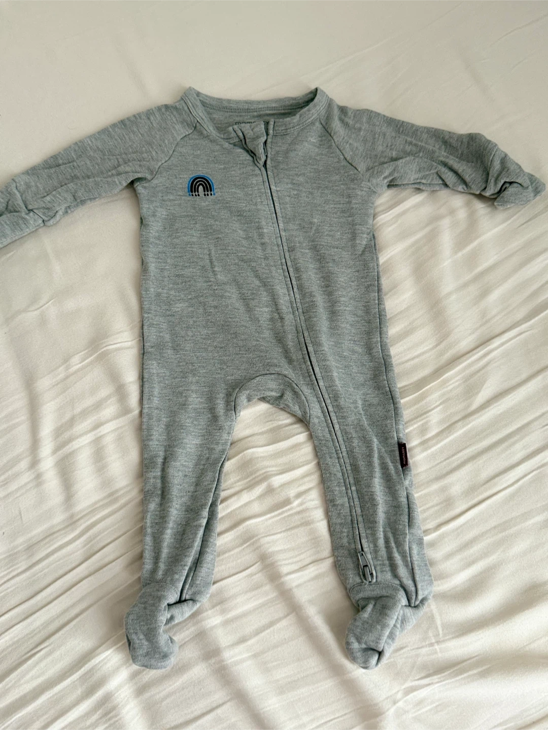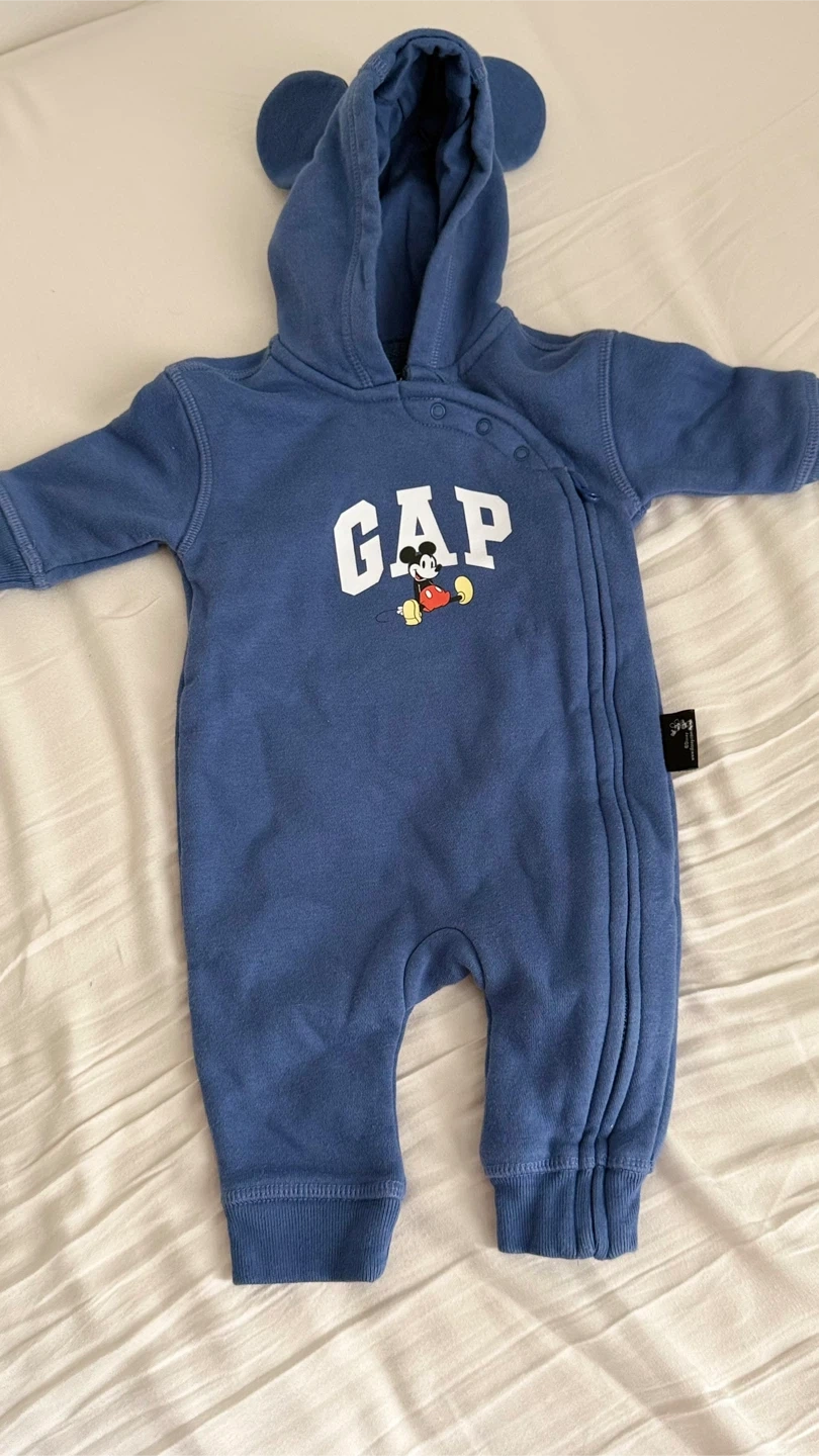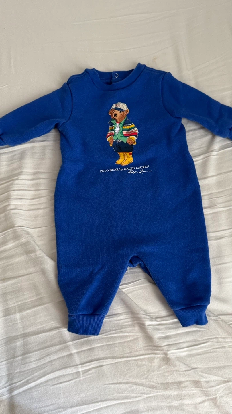 Selling a bundle of baby clothes! Includes a Ralph Lauren Polo Bear onesie, a cozy green teddy bear outfit, a blue GAP Mickey Mouse onesie, and a gray onesie. All in great condition and ready for a new home! Each piece is $10.