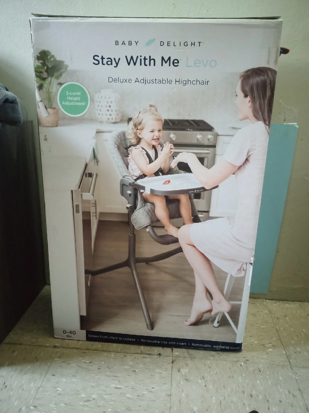 Selling a Baby Delight Stay With Me Levo Deluxe Adjustable Highchair! It grows with your child from infant to toddler and features a 5-level height adjustment. The tray is removable and has an insert, plus the cover is removable and washable for easy cleaning