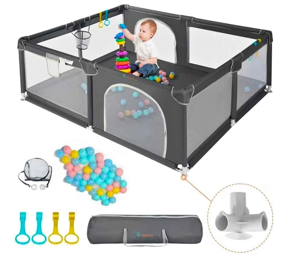 Brand new in the box! Never used! Color: Dark Grey Material: Oxford cloth, steel pipe, sponge, plastic Item dimensions L x W x H: 79 x 63 x 27 inches Age Range: Toddler UPC: 810139100386 The height and size of the playpen fit babies from 0 to 6 years old. It creates a dedicated space for your baby to play with toys and books. The playpen's structure is stable with thickened steel pipes, upgraded connectors, and strong suction cups. The 150D Oxford cloth and inner cotton cover are tear-resistant, with pad corner protection. The full-mesh design allows you to watch your baby and prevents dangerous postures. Your baby can see you while playing, which makes them feel more secure. The waterproof Oxford cloth is easy to clean. No tools are needed for the 10-minute assembly. A portable bag is provided for storage. The playpen includes 25 pit balls and a mini basketry to develop grasping ability. Four pull rings are equipped for your baby to stand and toddle.