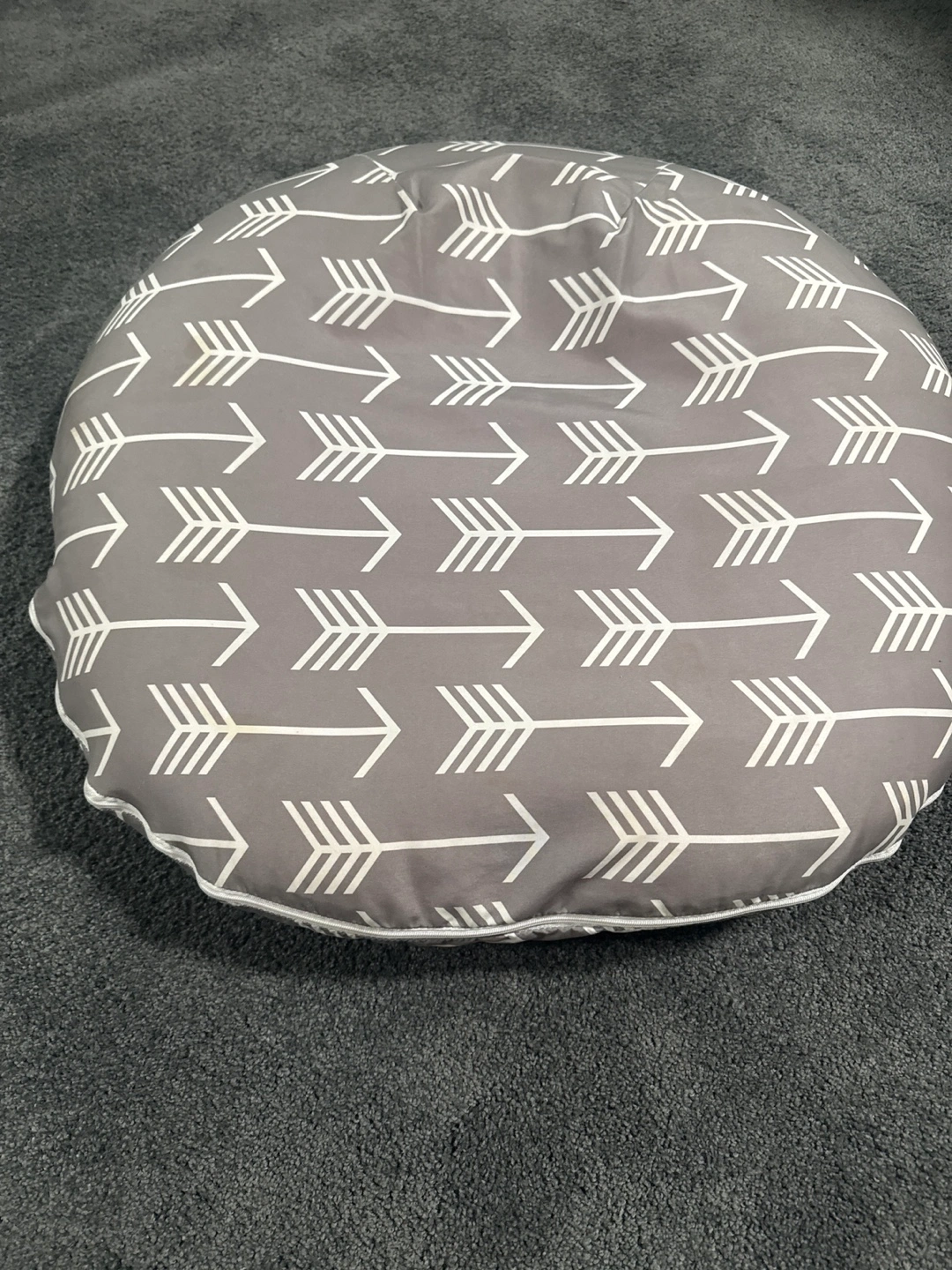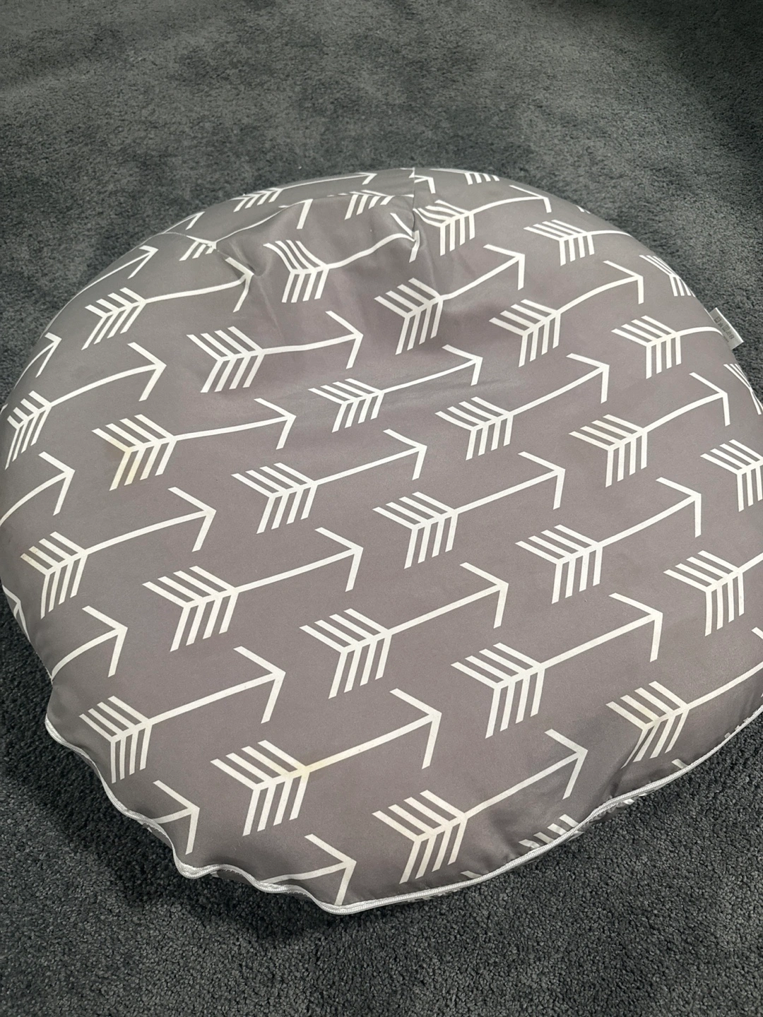 10Soft baby floor seat. Removable cover. Gray and white arrow pattern. Pink inner cushion. Suitable for infants.