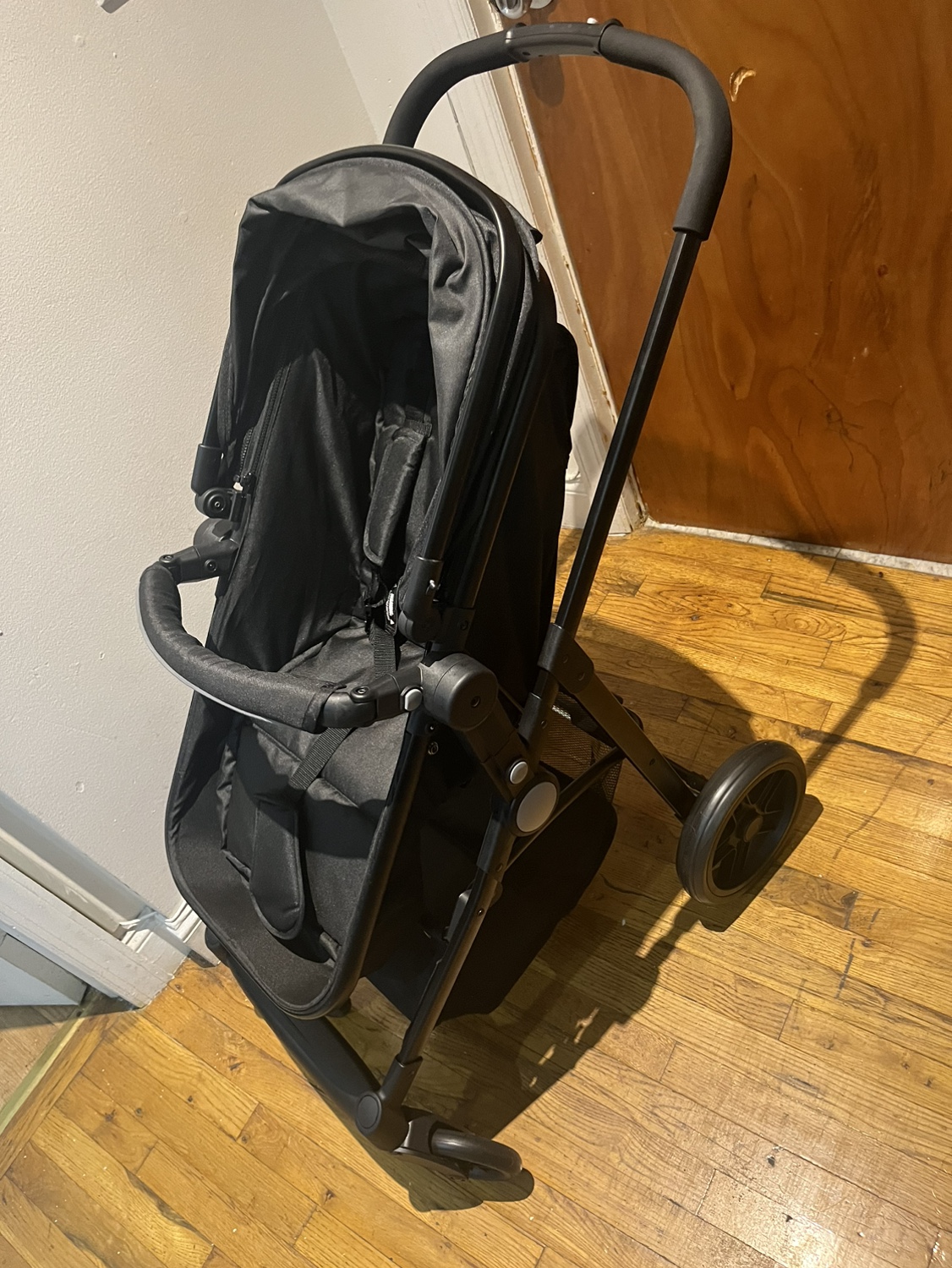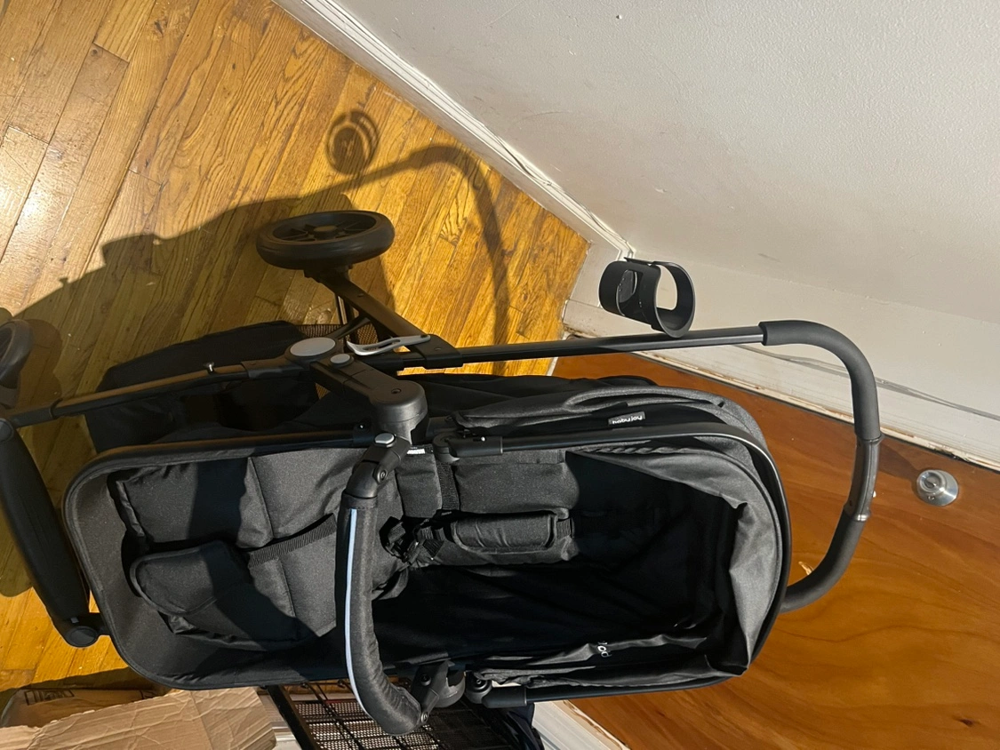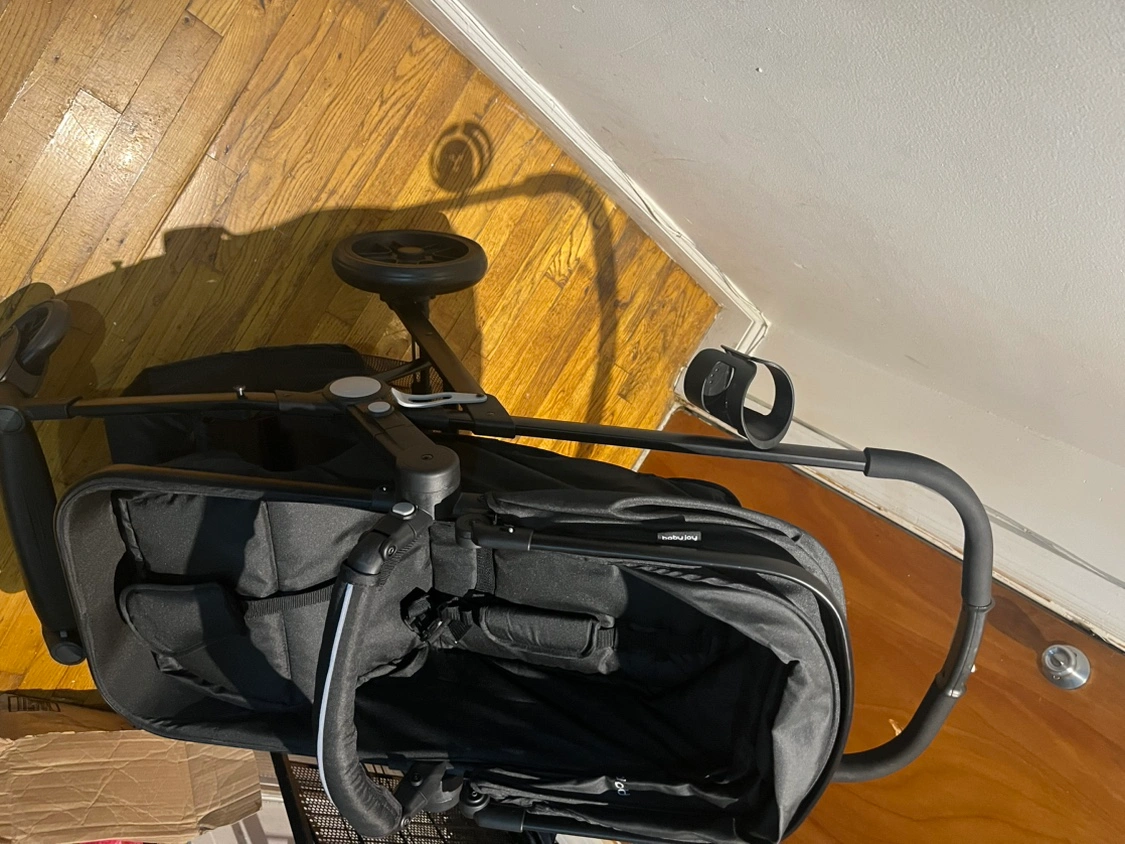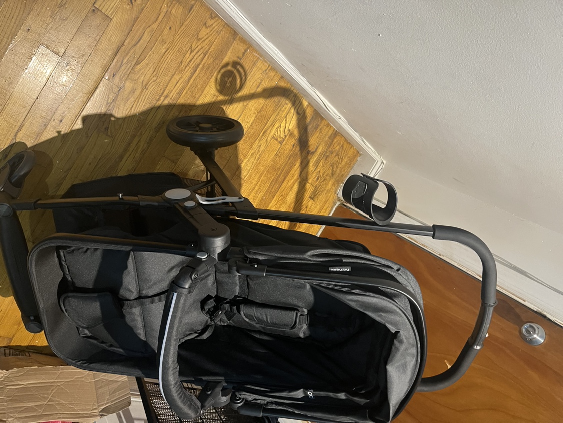 Black Baby Joy Stroller. It is lightweight and compact for easy travel. Comes with a cup holder. The canopy is adjustable and has a peek-a-boo window. The stroller is easy to fold and comes with a carrying strap. It has a five-point harness and is suitable for children up to 50 pounds.