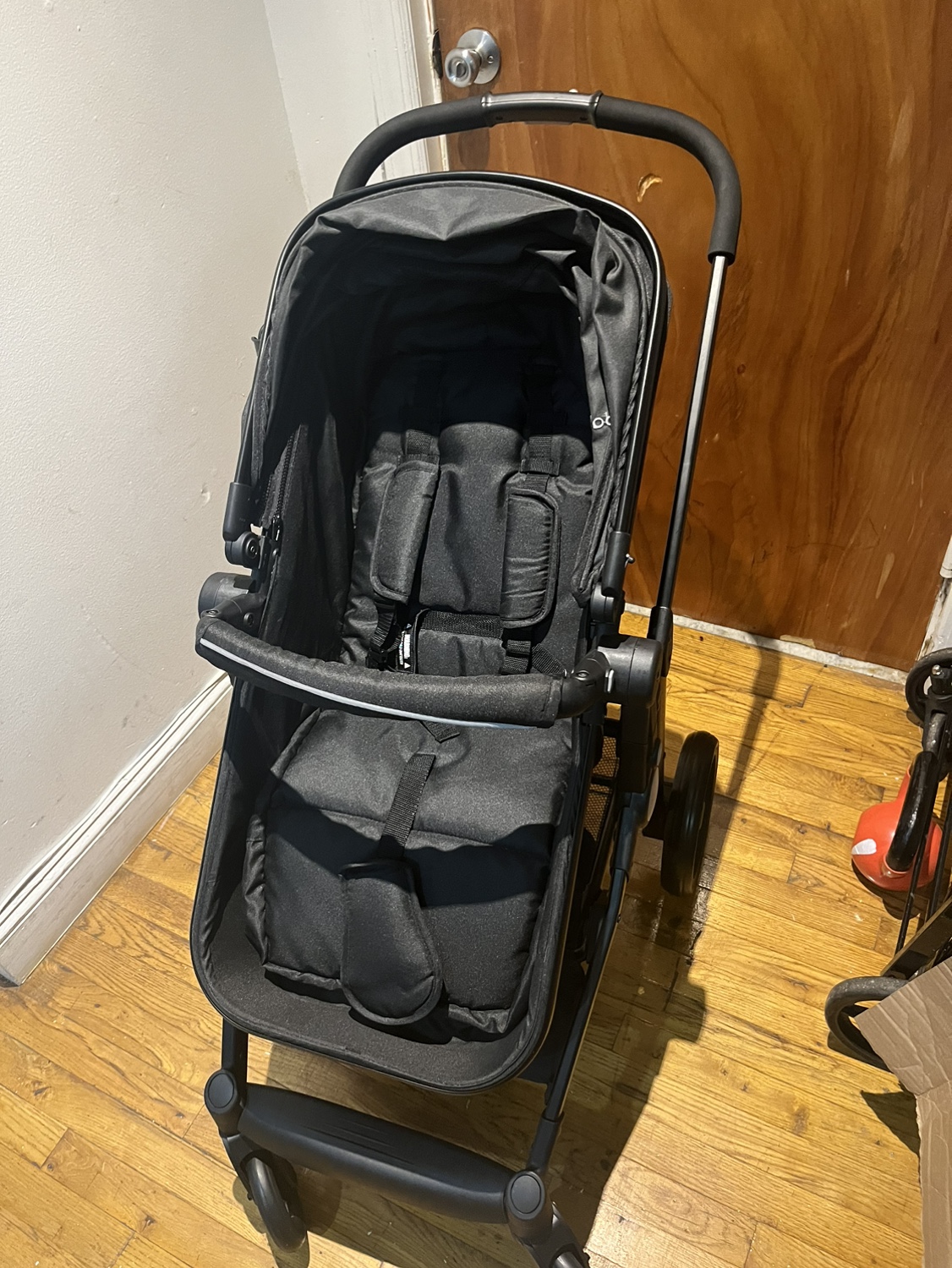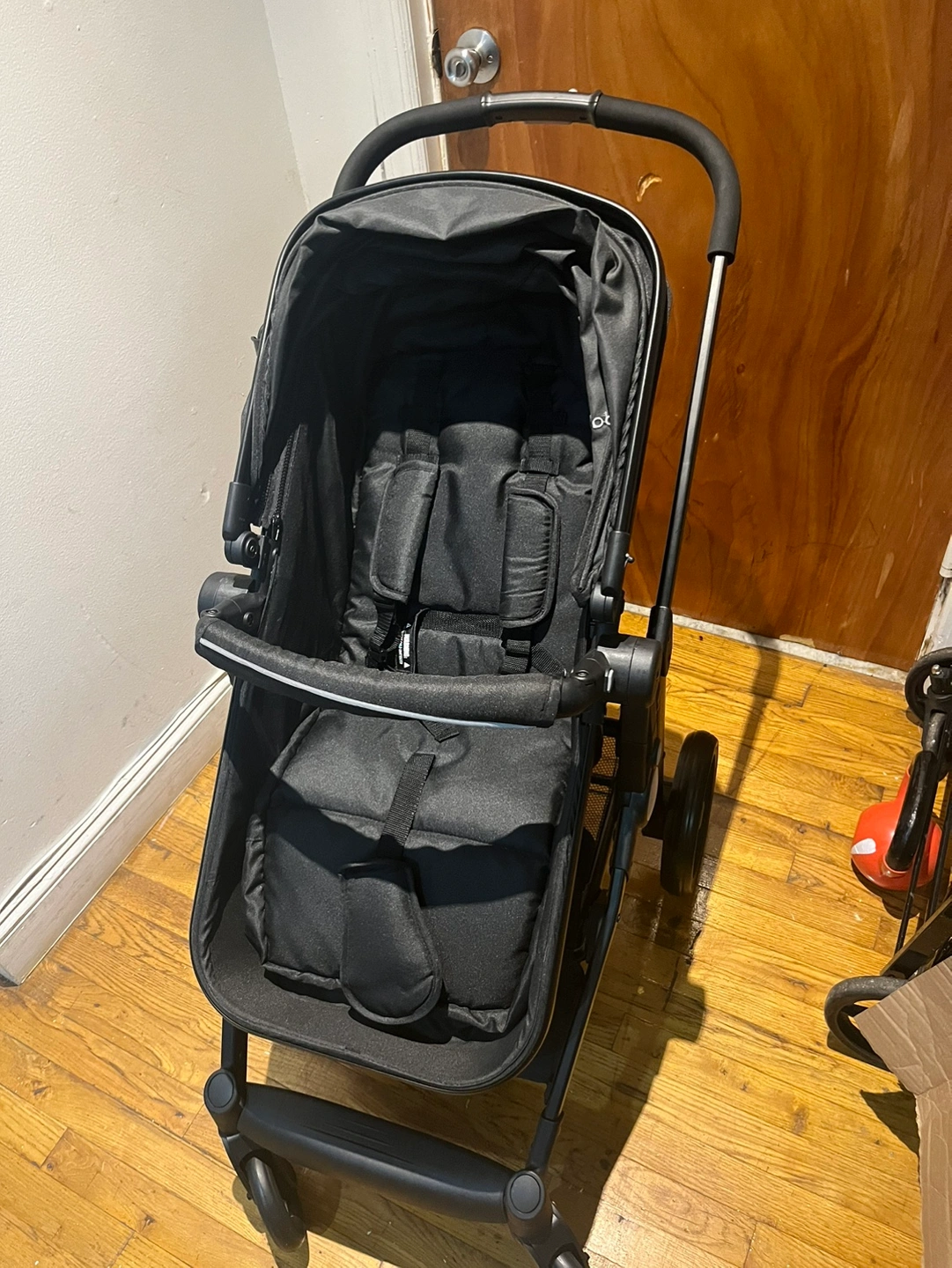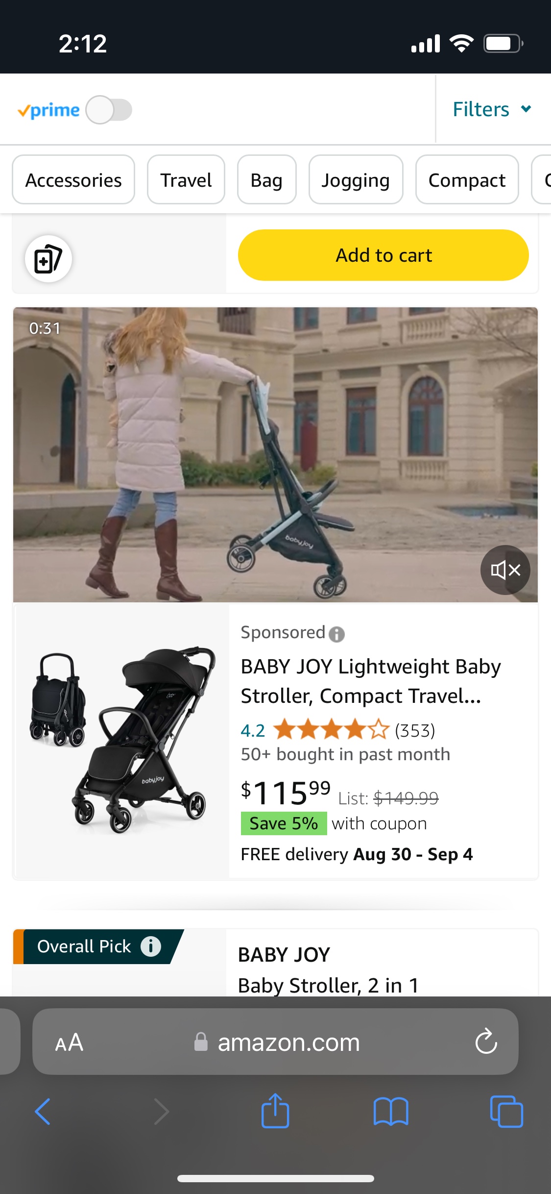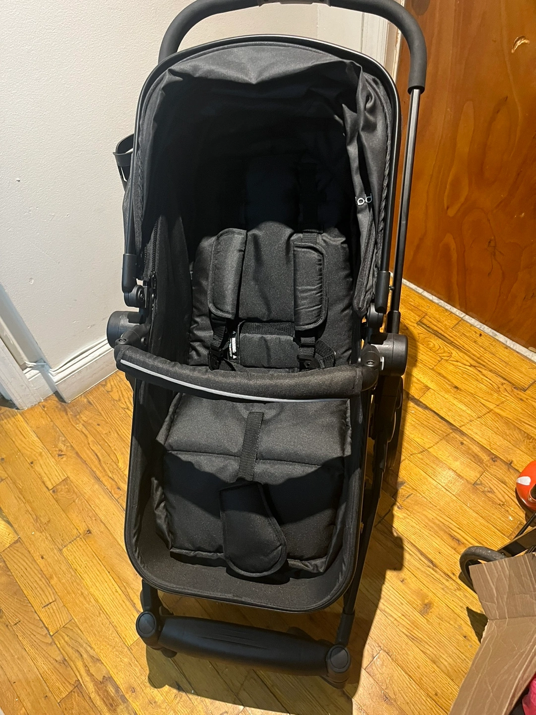 Black Baby Joy Stroller. It is lightweight and compact for easy travel. Comes with a cup holder. The canopy is adjustable and has a peek-a-boo window. The stroller is easy to fold and comes with a carrying strap. It has a five-point harness and is suitable for children up to 50 pounds.