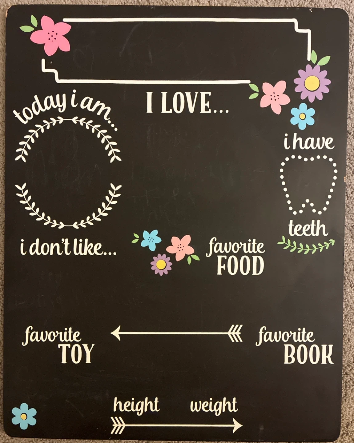 632This is a cute baby monthly milestone chalkboard to document your baby’s developmental stages! It has spaces for favorite food, toy, book, height, weight, and more. Pre owned As is Offers welcome