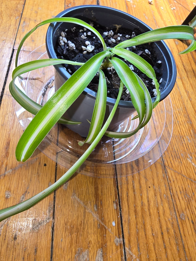 Selling a healthy spider plant in a gray pot with a clear saucer. It's ready to brighten up your space!