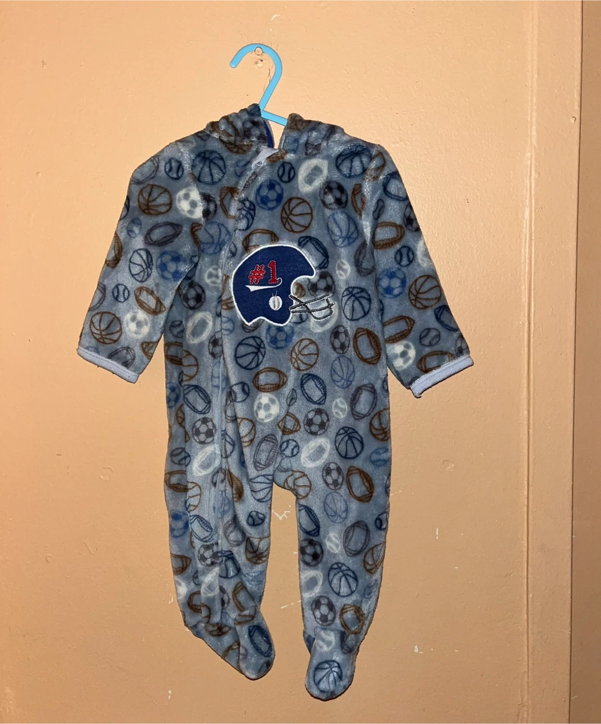1000+This adorable baby jumpsuit is made of soft fleece and features a fun sports print! It has a hood and long sleeves to keep your little one warm and cozy. The jumpsuit has a blue color scheme with football, basketball, and soccer ball designs all over. Size 3-6 months