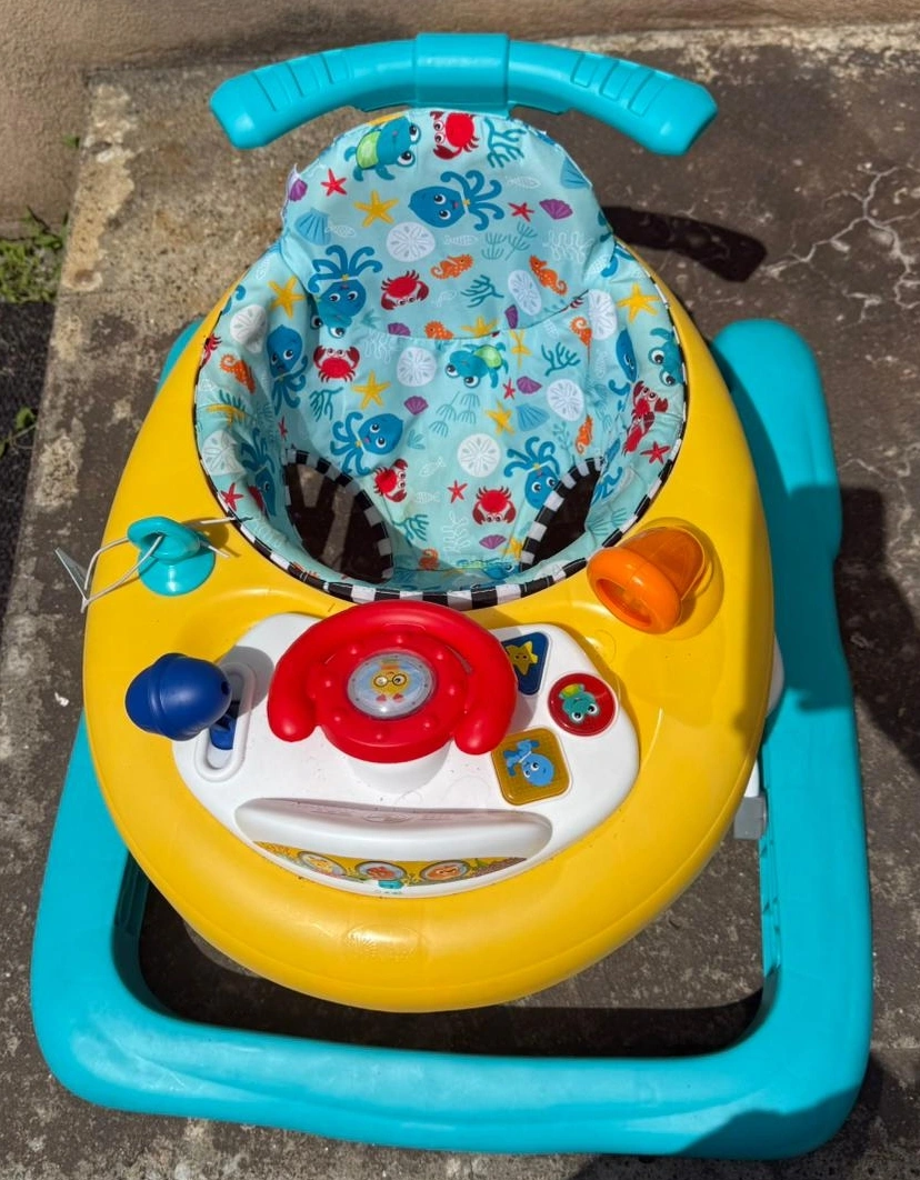 10Selling a baby walker in good condition! It features a colorful design with yellow and blue accents. Perfect for helping your little one take their first steps and explore the world around them