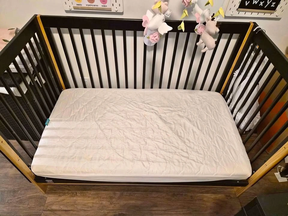 15Black Crib with wooden accents barely used. My kid mainly used it to read or watch TV in their room and we're upgrading to a twin in the hopes she'll sleep in her room ๐ Also including 1 mattress protector, 2 Crib sheets for free and the mobile if you need. Front Crib piece is in storage. Everything is is almost new condition Dimensions Width: 54.25" Height: 34.00" Depth: 30.75"