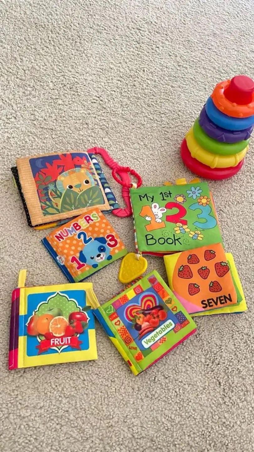 Soft fabric books, great for babies. Includes Numbers, My First Book, Fruit, Vegetables, and Seven. Also a colorful stacking ring toy.