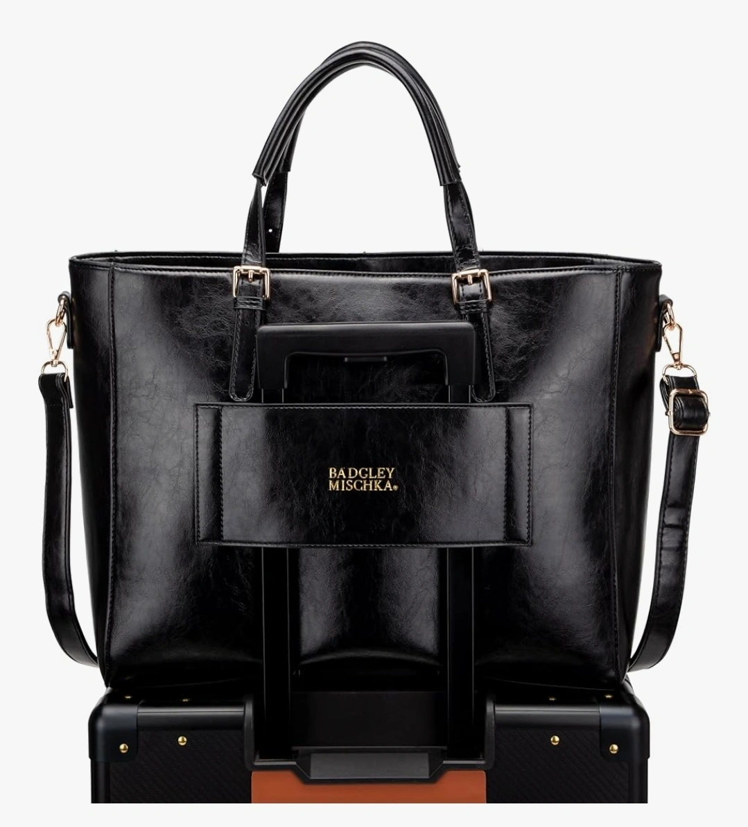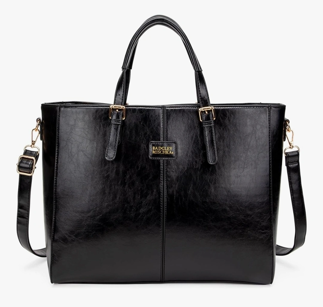 81This is a Badgley Mischka black tote bag. It's a stylish and functional bag that measures approximately 17" x 12" x 7". Perfect for carrying your essentials in style!
