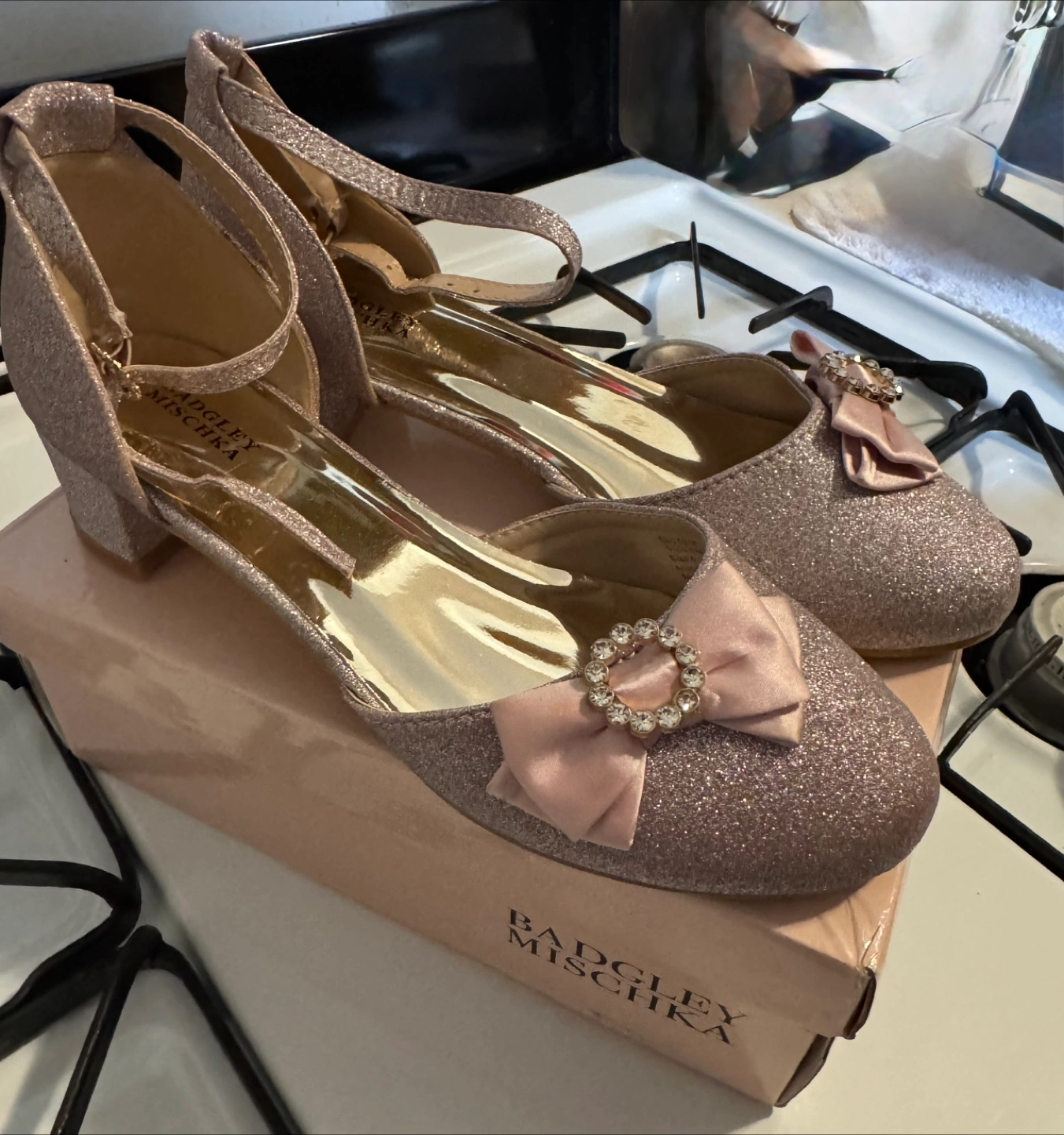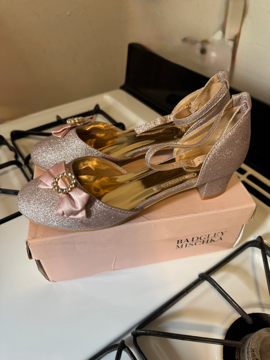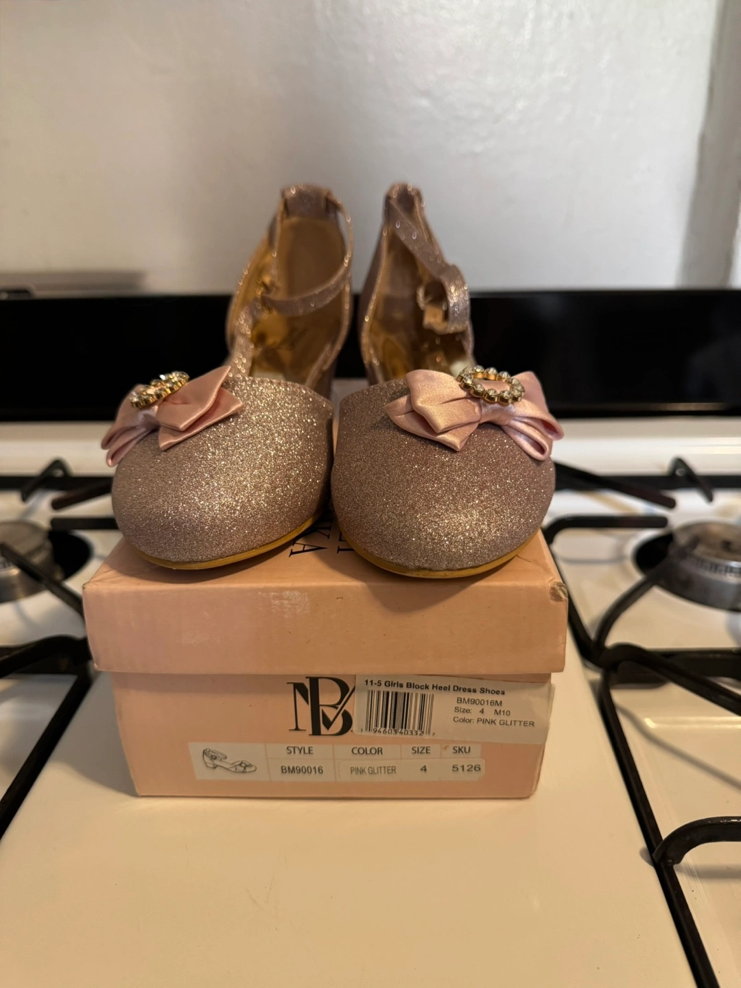 These adorable Badgley Mischka girls' dress shoes are in a size 4 and come in a beautiful pink glitter color. The shoes are in excellent condition and come with the original box. Perfect for any special occasion!