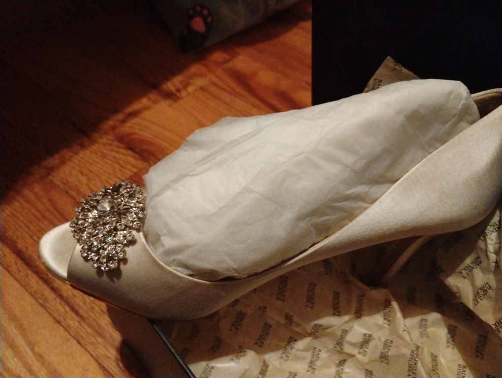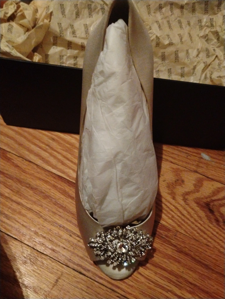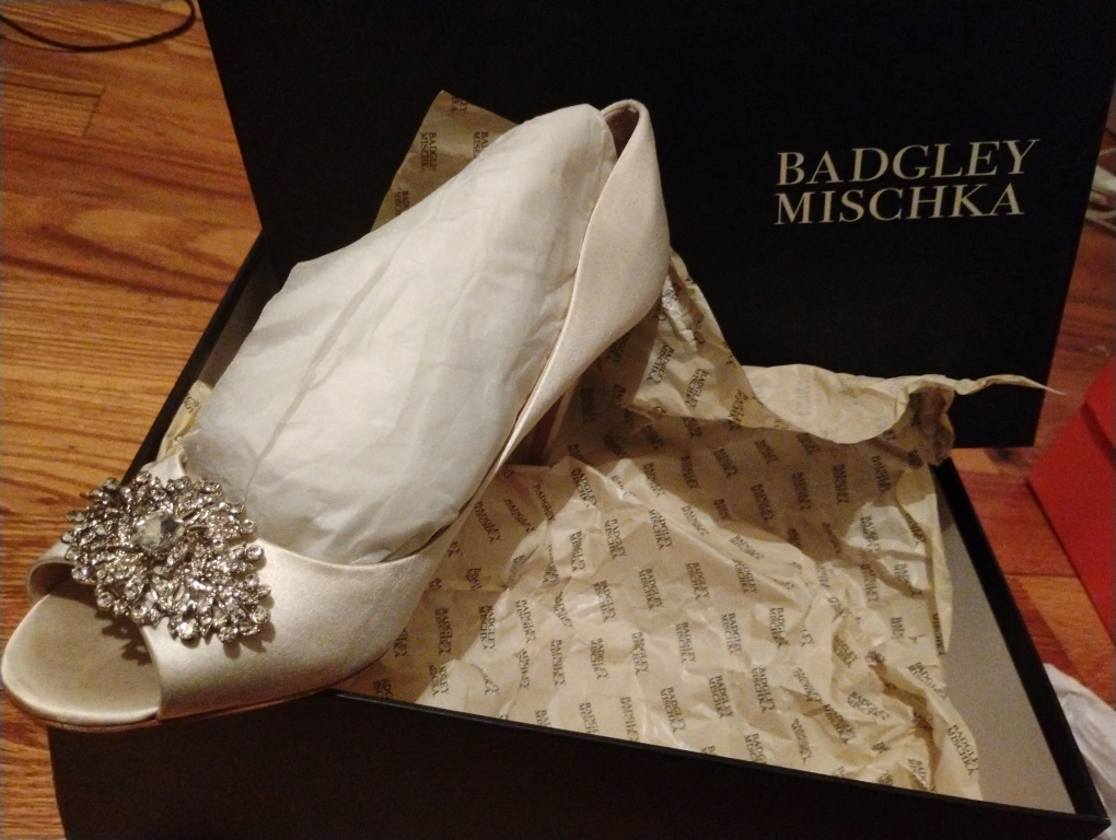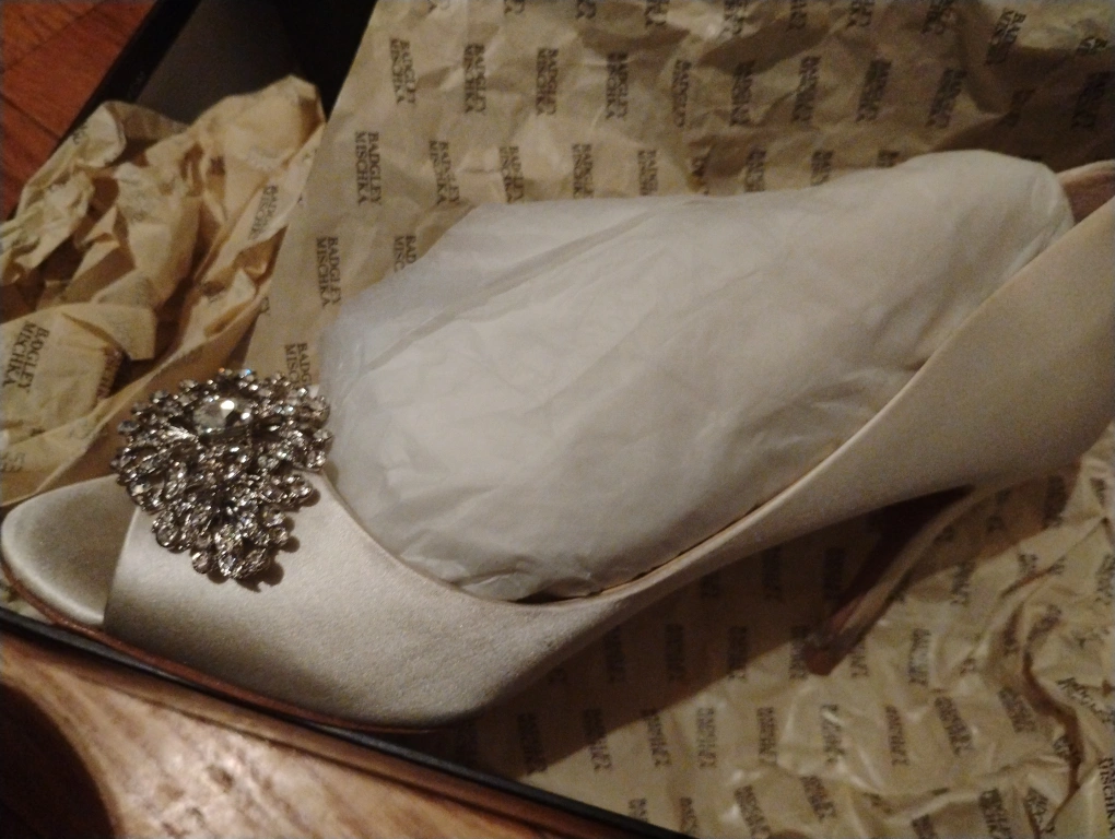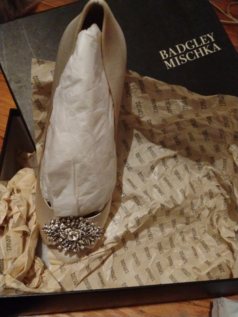These Badgley Mischka heels are in excellent condition and come with the original box! They are a size 7.5 and feature a beautiful rhinestone embellishment on the toe. Perfect for a special occasion!