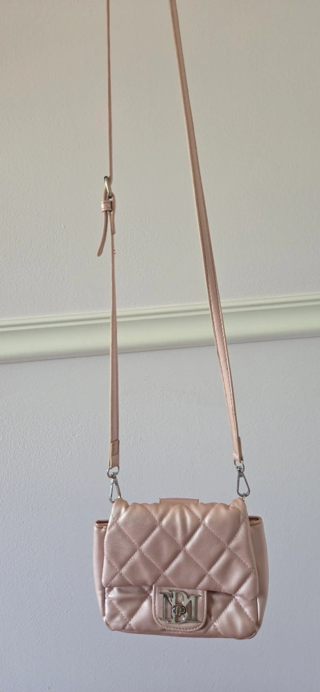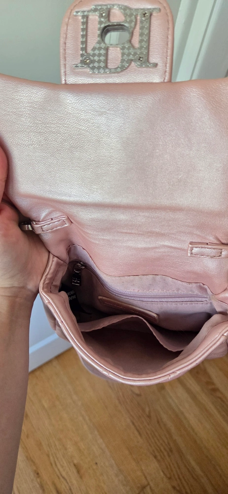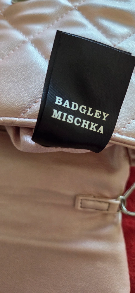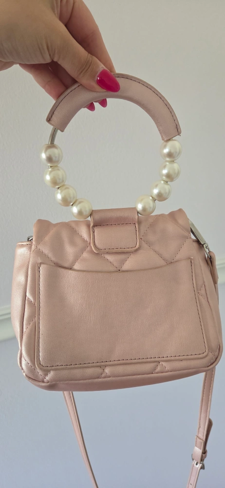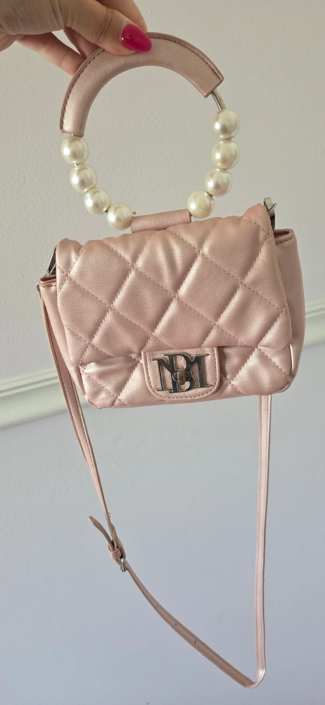 This is a Badgley Mischka crossbody bag in a beautiful pink color! It features a quilted design and a unique pearl handle. It's perfect for adding a touch of elegance to any outfit!
