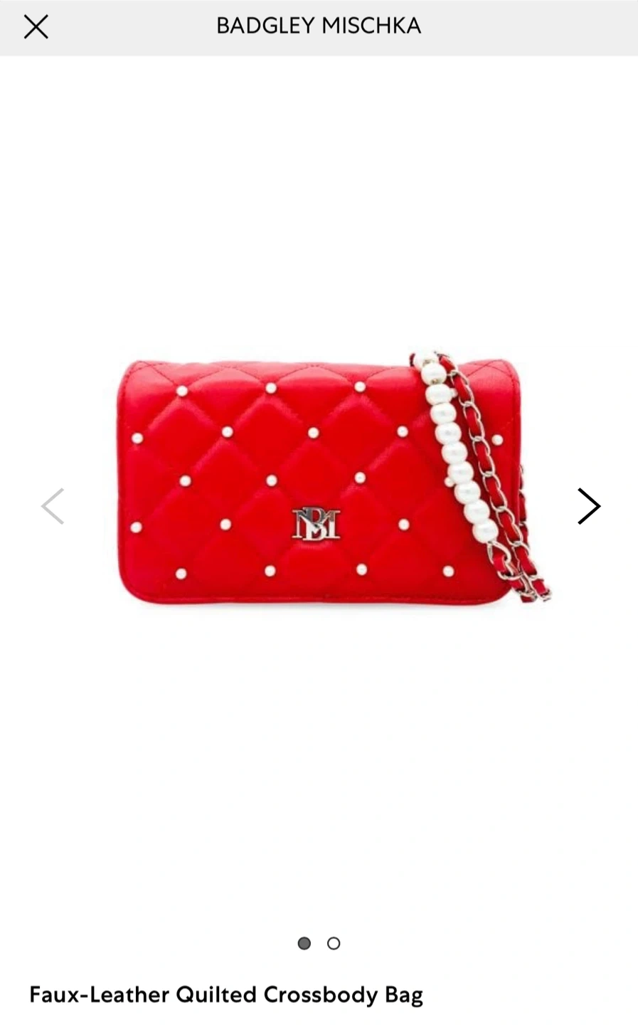 10I'm selling a New Badgley Mischka quilted crossbody bag! It's a stylish bag with a quilted design and a chain strap accented with faux pearls. Available in red and black, it's a great accessory to elevate your look. Originally bought for $129.00 , plus tax