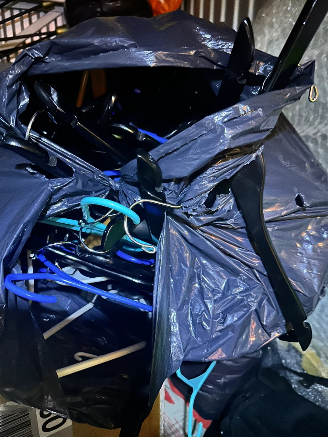 81I have a bag full of mixed clothes hangers, including plastic and wire ones. They come in various colors like black, blue, and white. Perfect for organizing your closet!