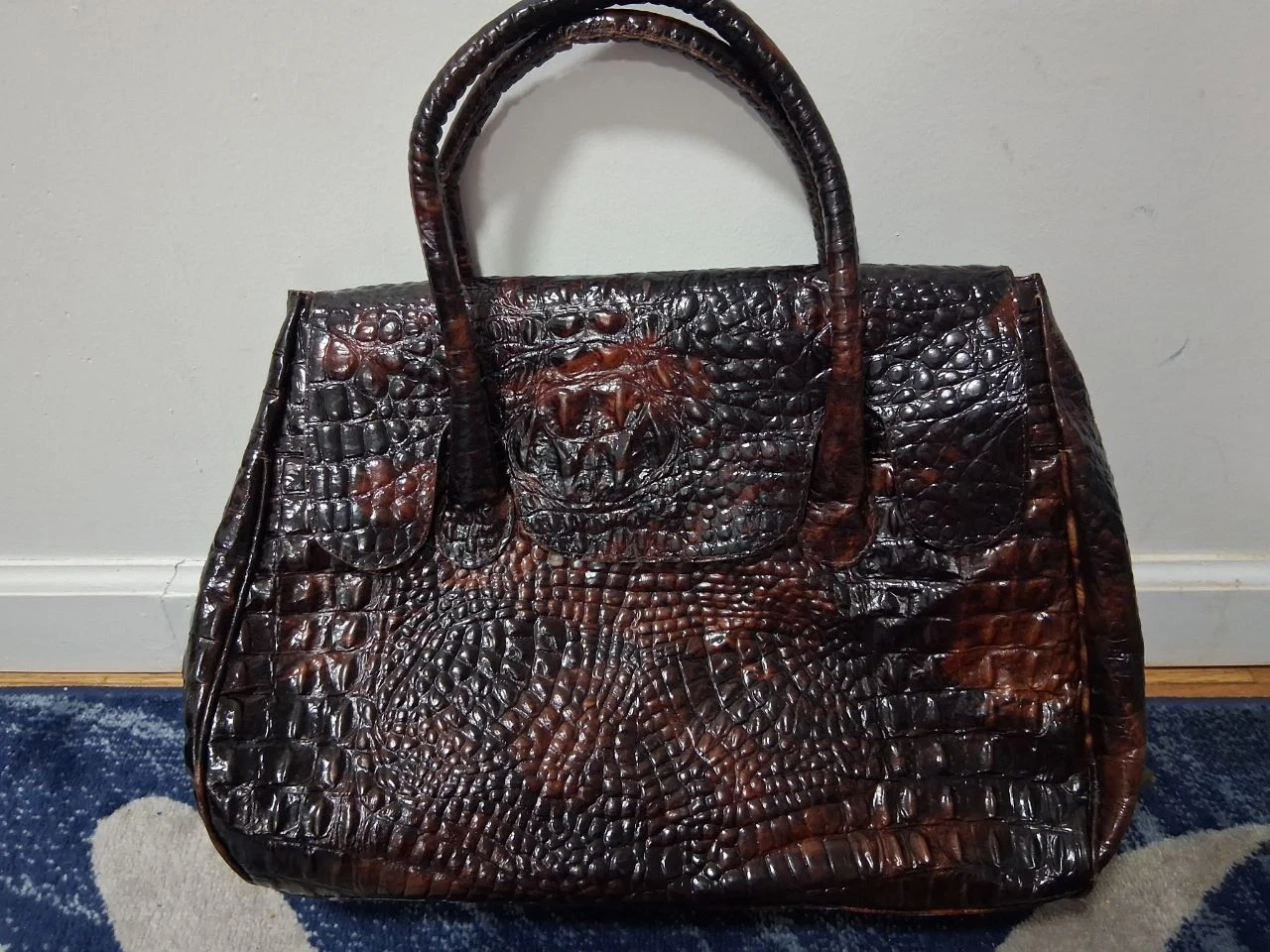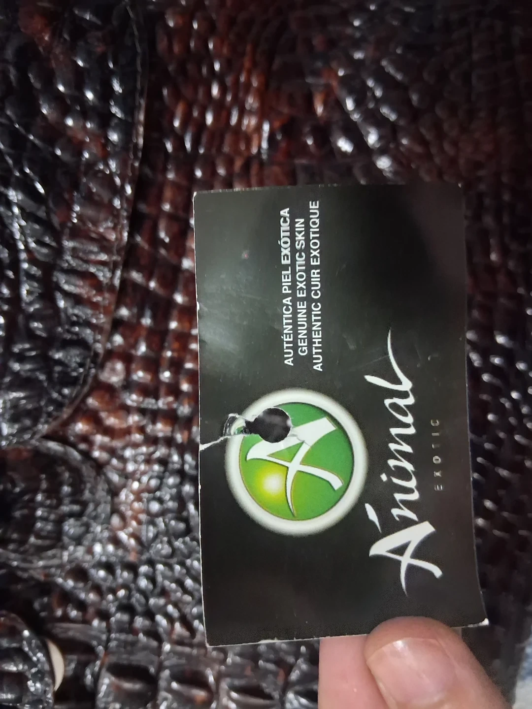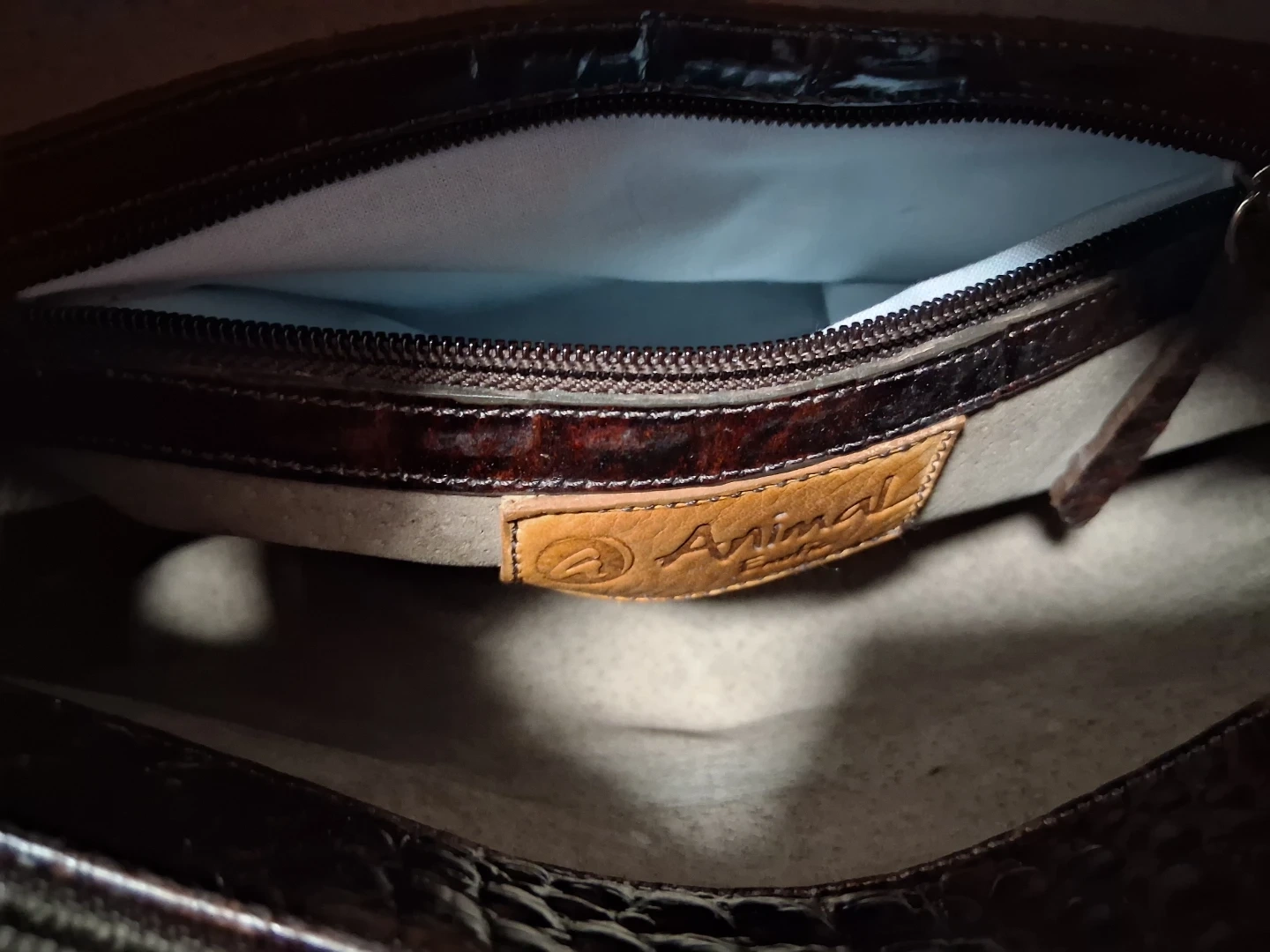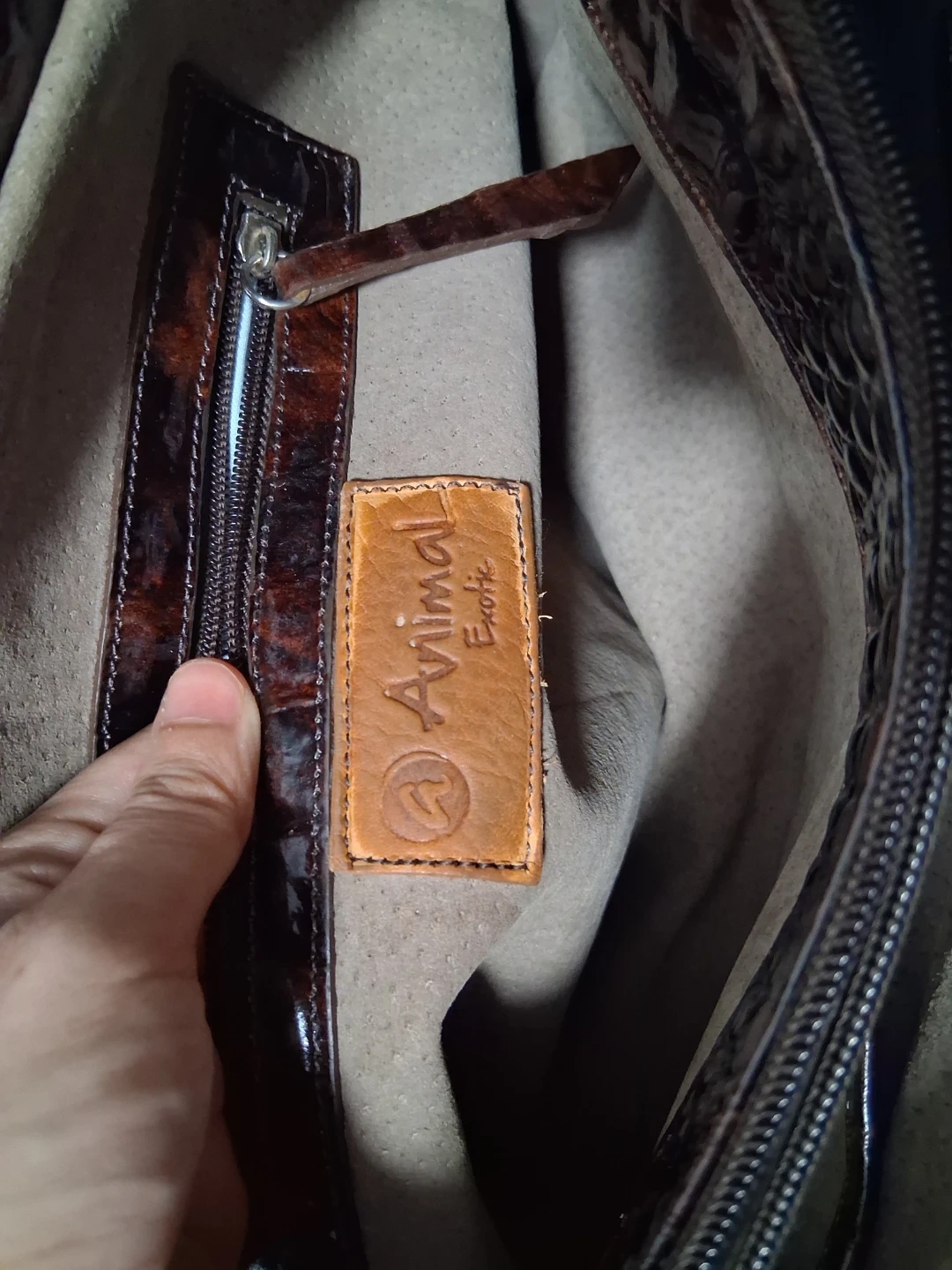This is a brown leather bag from Animal Exotic. It has a unique style and authentic crocodile leather bag . It's in good condition and ready for a new home!