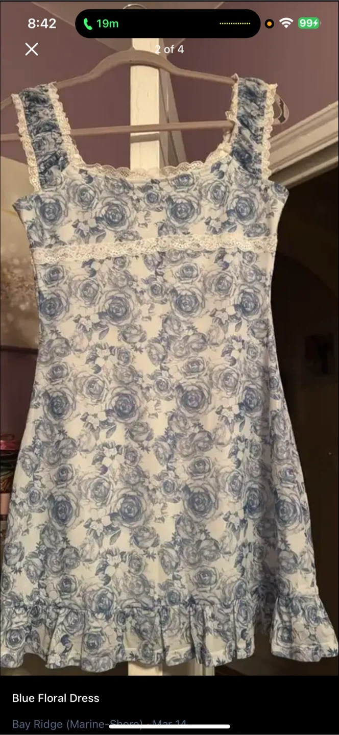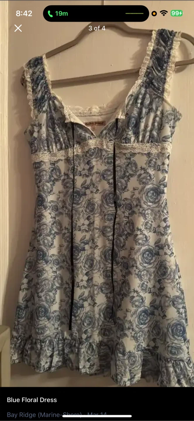 Here's a cute Bailey Rose dress in a blue floral pattern! It's a size M and features delicate lace trim and black ribbon details. Perfect for a spring or summer day!