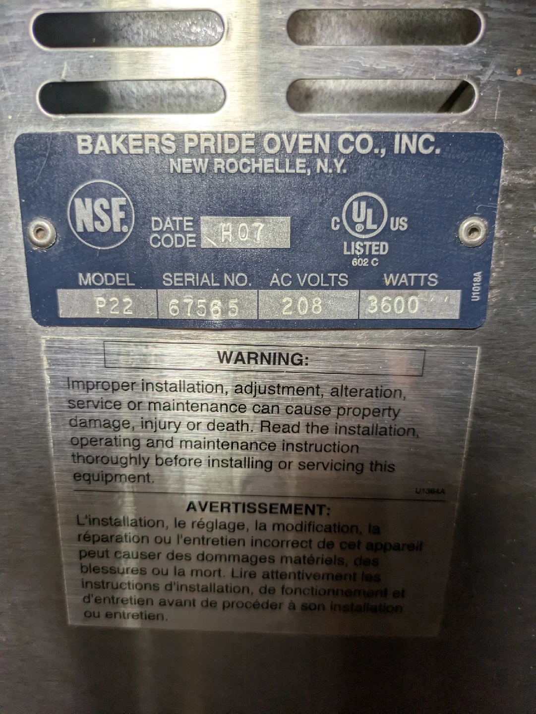10Selling a Bakers Pride P22 oven. It shows signs of use but is still functional. The model number is P22 and it operates at 208 AC Volts, 3600 Watts.