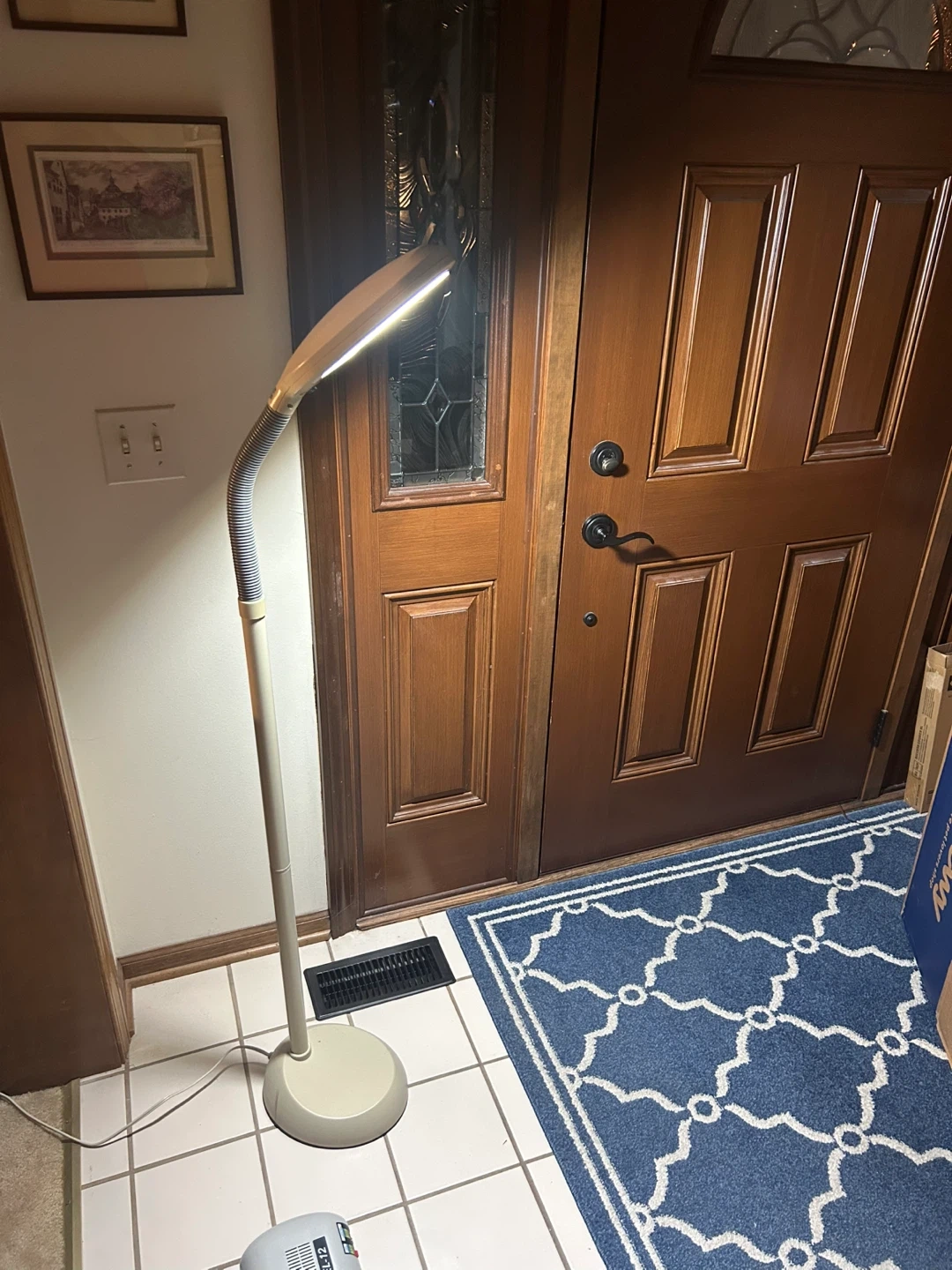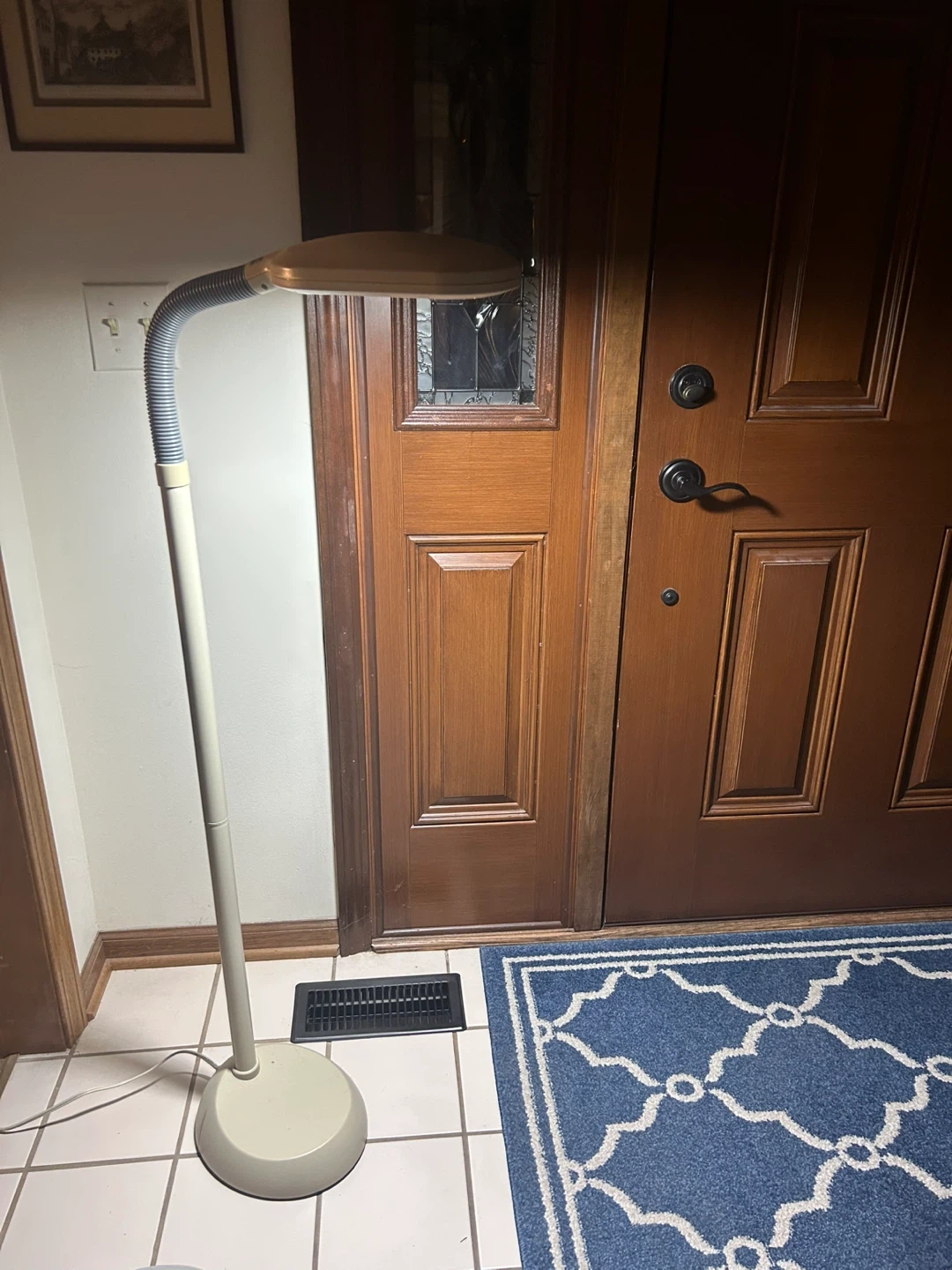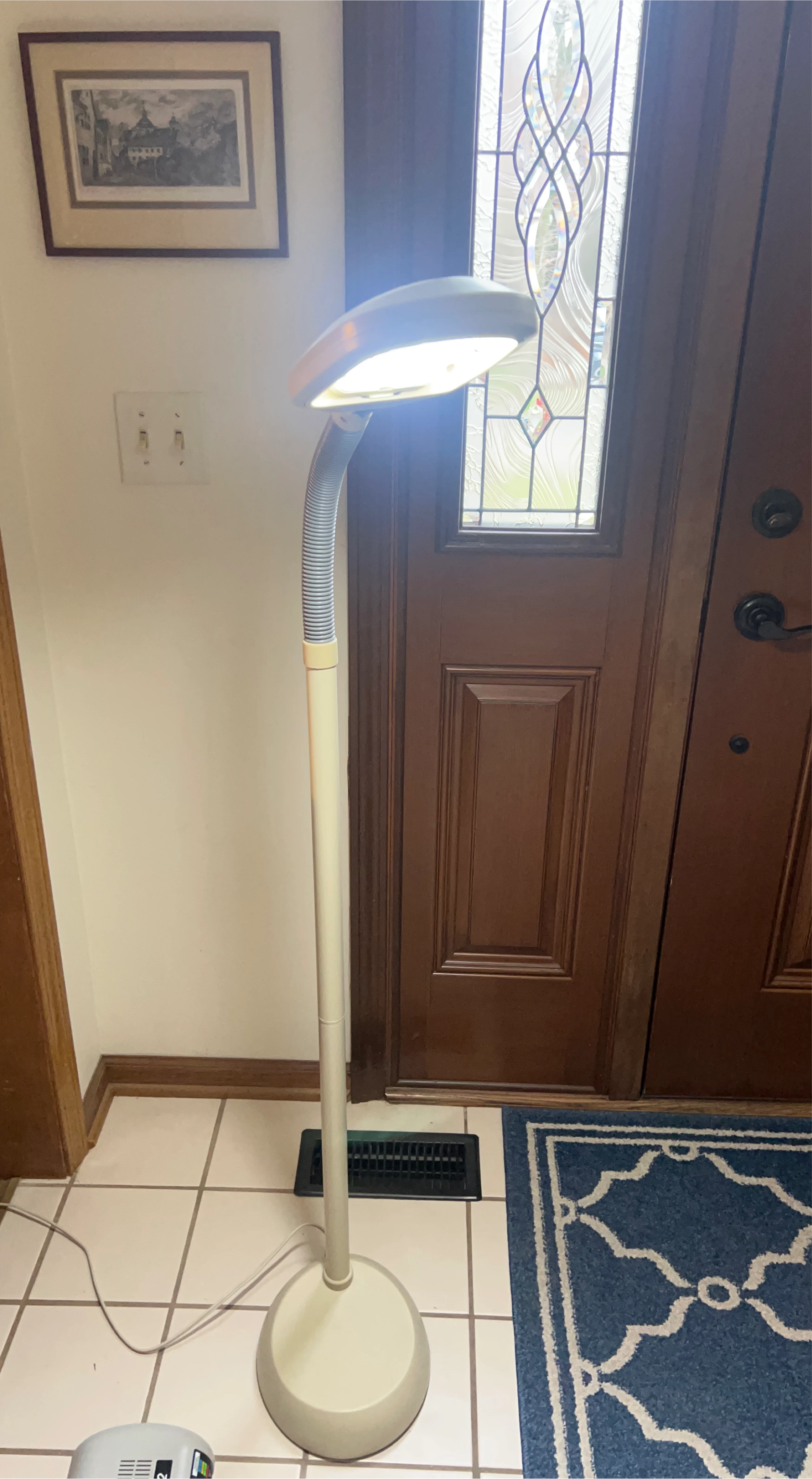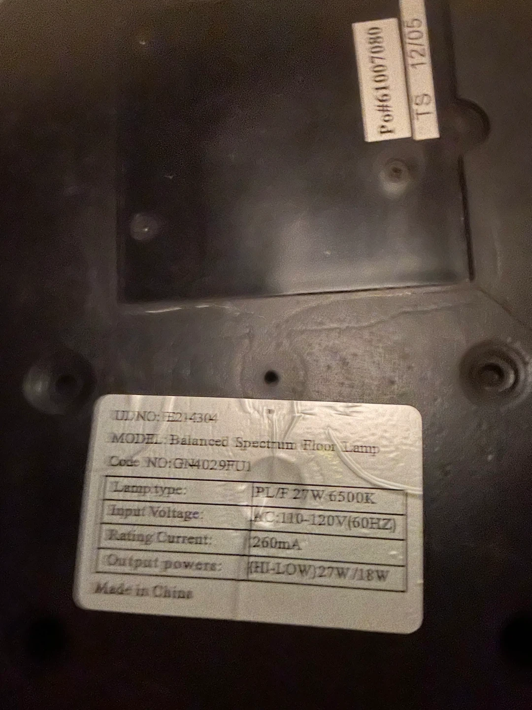 15Balanced Spectrum Floor Lamp. It has a PL/F 27W 6500K lamp type. The input voltage is AC 110-120V (60Hz). The rating current is 260mA, and the output powers are (HI-LOW) 27W/18W. There are some signs of use. Floor lamp with an adjustable gooseneck design! The lamp is in good condition and has a flexible neck, making it easy to direct light where you need it. Great for reading or any task that requires focused lighting. A balanced spectrum floor lamp, like the GN4029FU1, aims to replicate natural daylight to provide clear, bright, and easy-on-the-eyes illumination. These lamps are often used for reading, crafting, and other detailed tasks, offering a Color Rendering Index (CRI) that ensures good color accuracy. Color: Almond/grey *Small mark on base, see picture Pickup in Palatine First come, first serve
