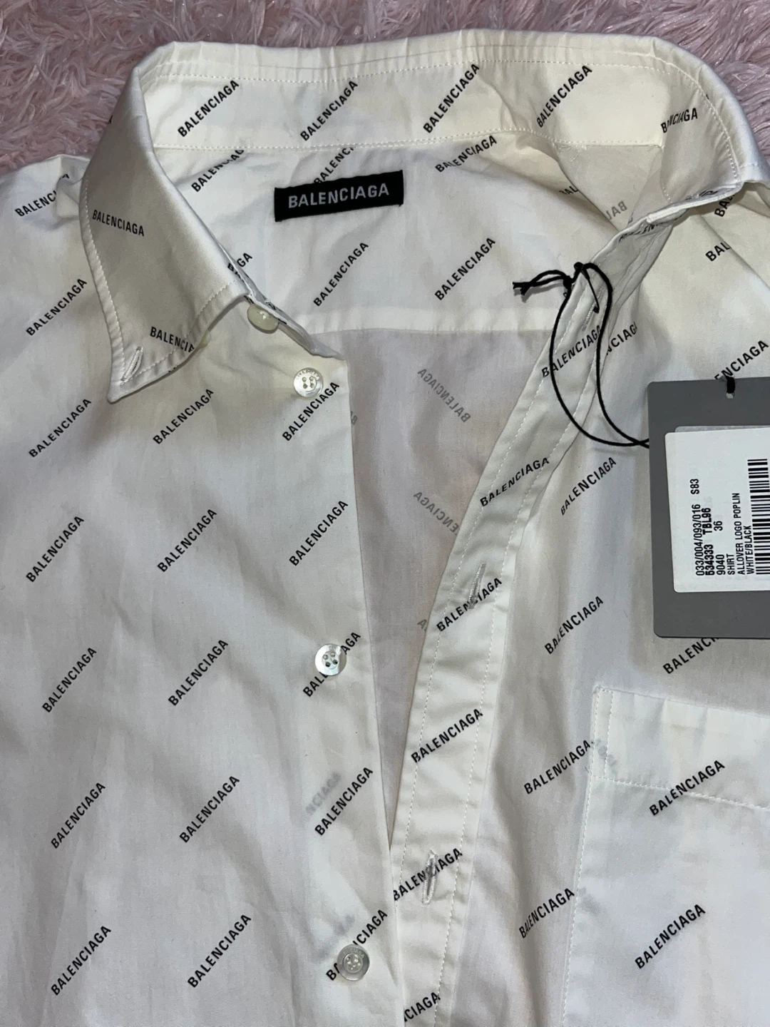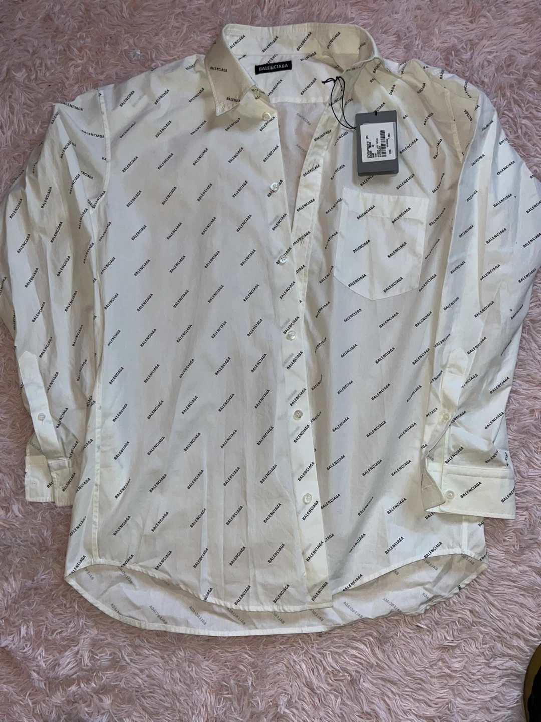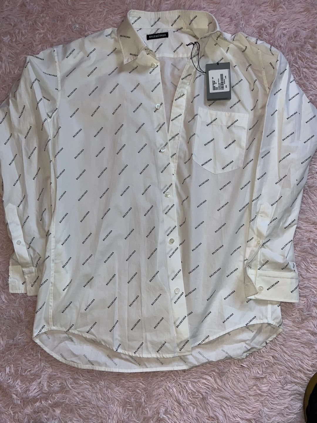 Selling a Balenciaga Allover Logo Poplin Shirt in size 36. The shirt is white with black Balenciaga logos all over. Shirt is button down. Men shirt but can be unisex. Brand New. Authentic.